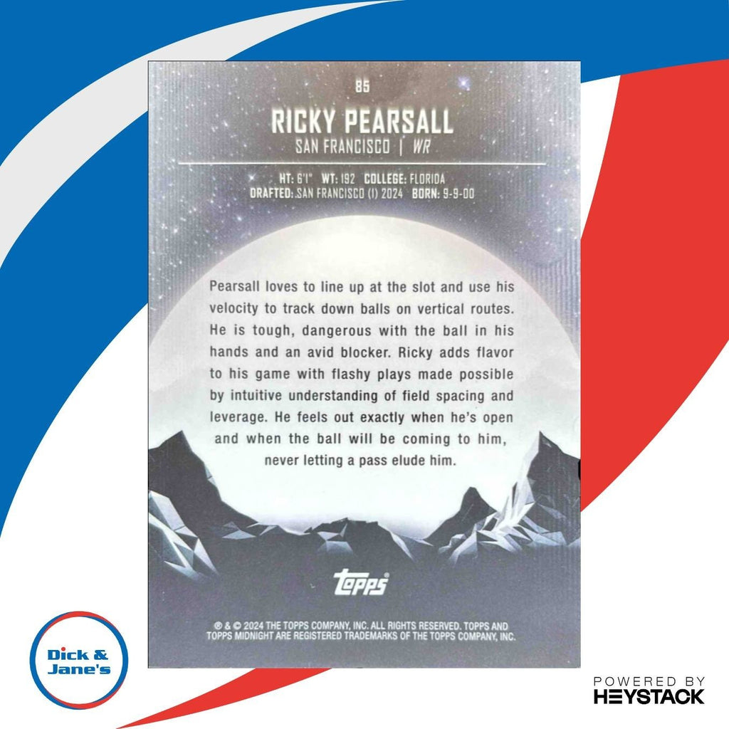 This limited edition 2024 Topps Midnight Ricky Pearsall Equinox trading card is a must-have for any San Francisco 49ers fan. Featuring a stunning design and numbered 12/20, this rookie card is a rare find. Don't miss your chance to own a piece of NFL history with this highly collectible item. Listed With Mascot.