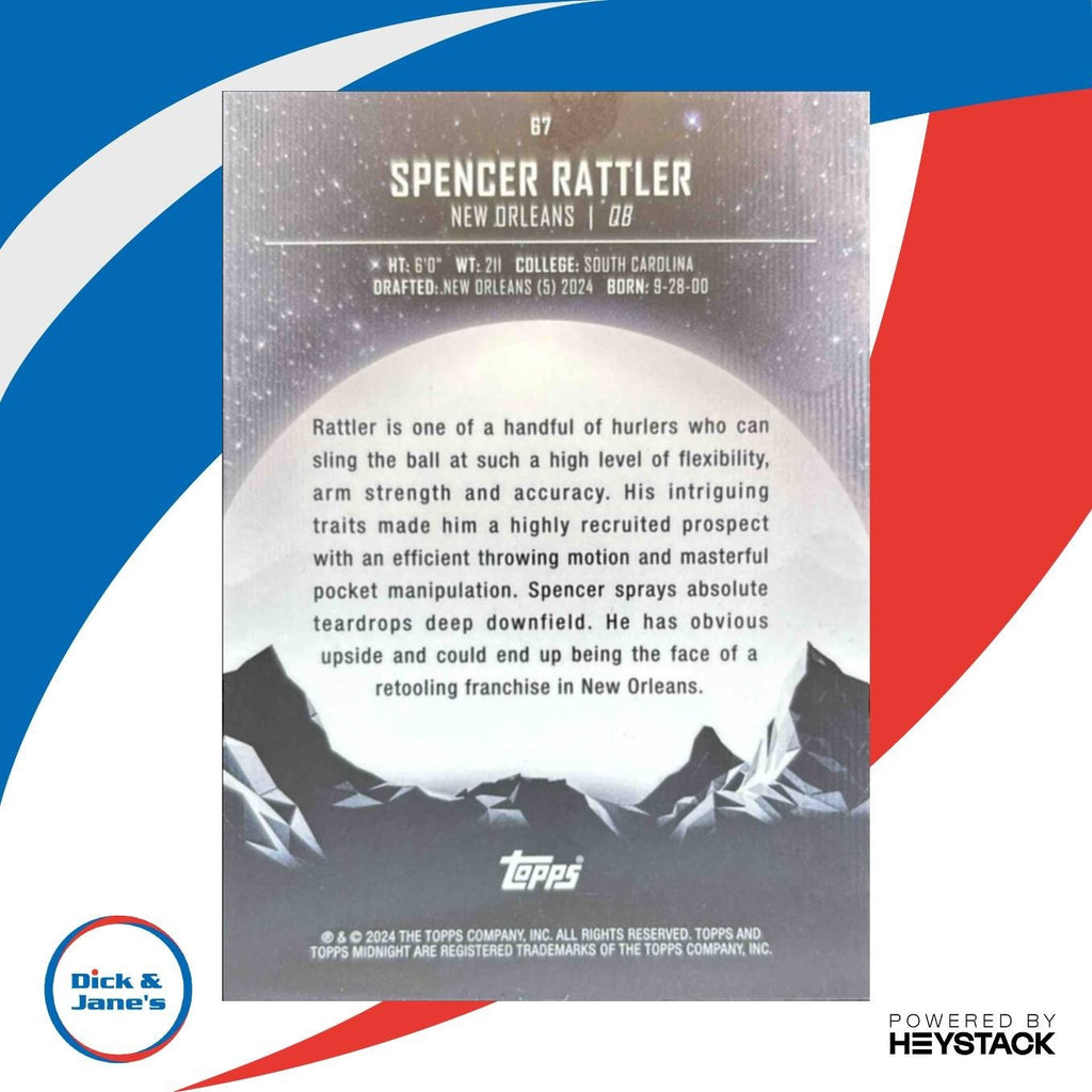 This rare sports trading card features Spencer Rattler in his rookie year with the New Orleans Saints. The 2024 Topps Midnight edition card is a must-have for any collector, showcasing the rise of a promising NFL star. Don't miss out on adding this exclusive RC card to your collection today! Listed With Mascot.
