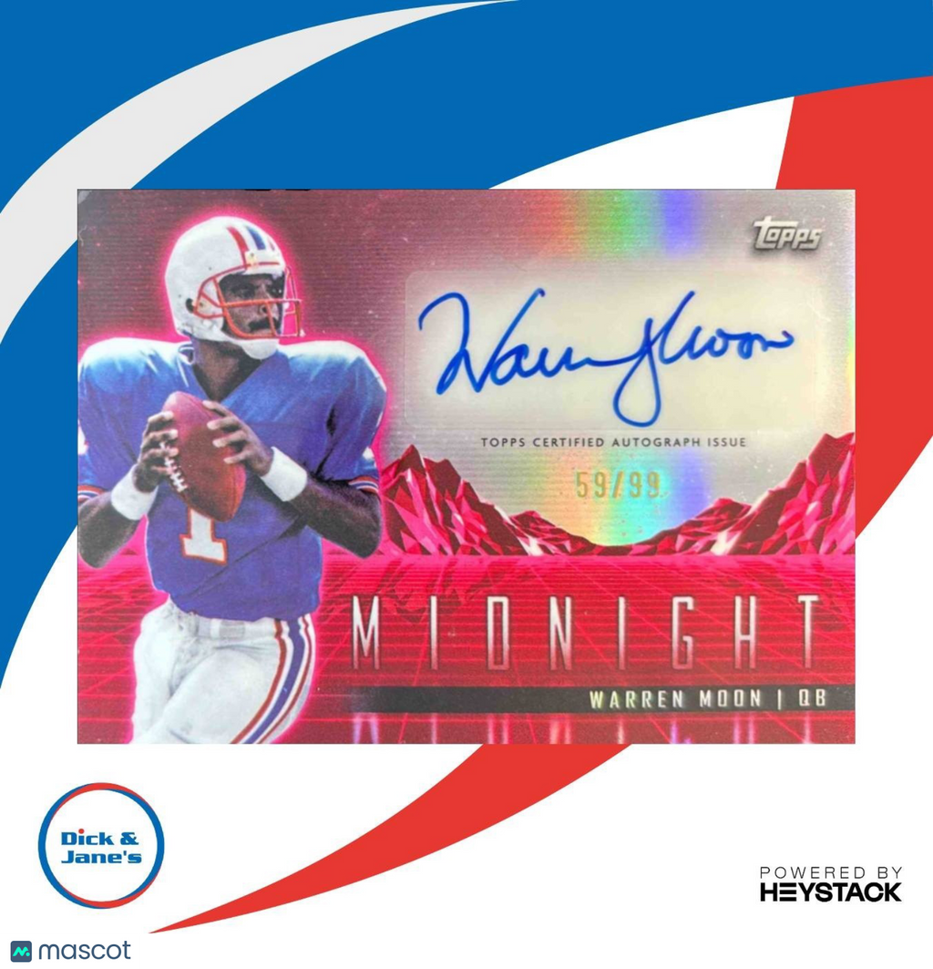 Rare 2024 Topps Warren Moon trading card featuring his signature. Limited edition Horizon Signatures Twilight card numbered 59 out of 99. Perfect for any collector or fan of the Hall of Fame quarterback. Don't miss out on adding this unique card to your collection! Listed With Mascot.