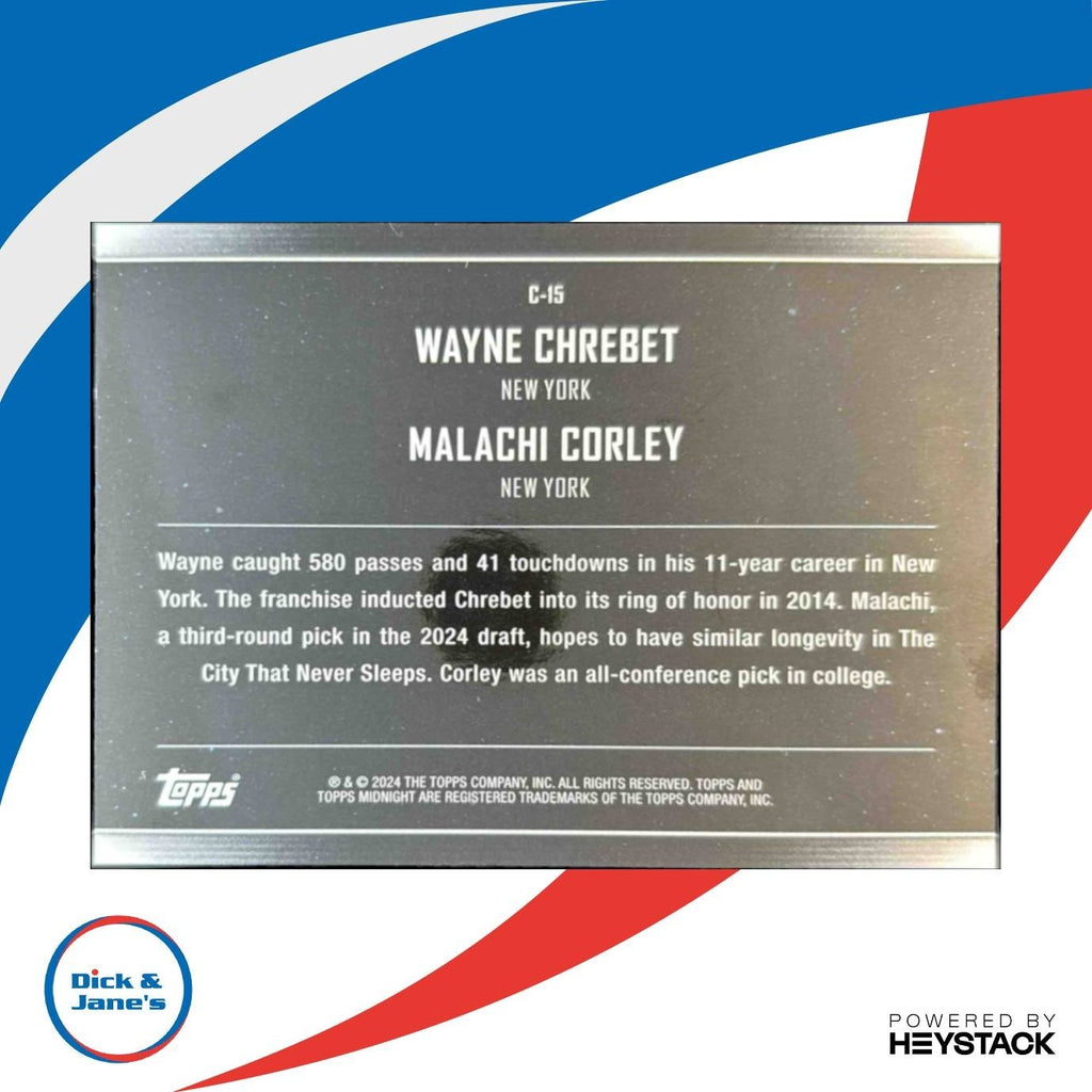 The 2024 Topps Midnight Wayne Chrebet Malachi Corley Constellations #C-15 RC Jets trading card is a must-have for NFL collectors! This rare rookie card features stunning midnight-themed design and showcases the talented duo of Chrebet and Corley. Add this unique and valuable card to your collection today! Listed With Mascot.