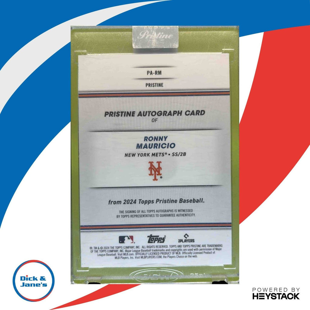 This 2024 Topps Pristine Ronny Mauricio Auto Green Refractor /150 RC New York Mets MLB trading card is a must-have for any collector. Featuring an autograph of the rising star on an eye-catching green refractor background, this limited edition card is sure to be a valuable addition to your collection. Don't miss out on the chance to own a piece of baseball history! Listed With Mascot.