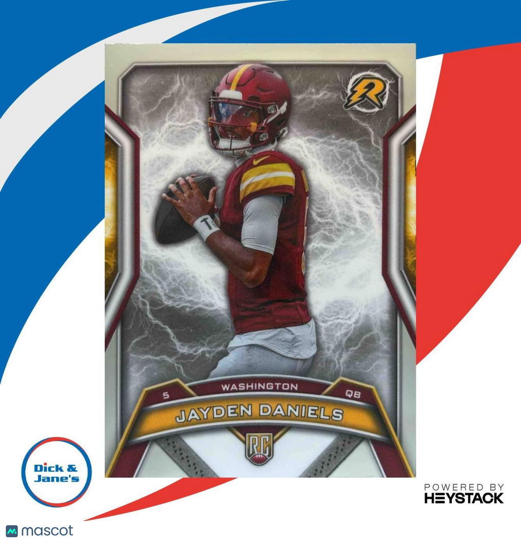 : Get your hands on the highly sought-after 2024 Topps Resurgence Jayden Daniels #196 RC Washington Commanders NFL trading card. This rookie card features the rising star quarterback in his official Commanders uniform, making it a must-have for any football card collector. Don't miss out on adding this rare and valuable card to your collection today! Listed With Mascot.