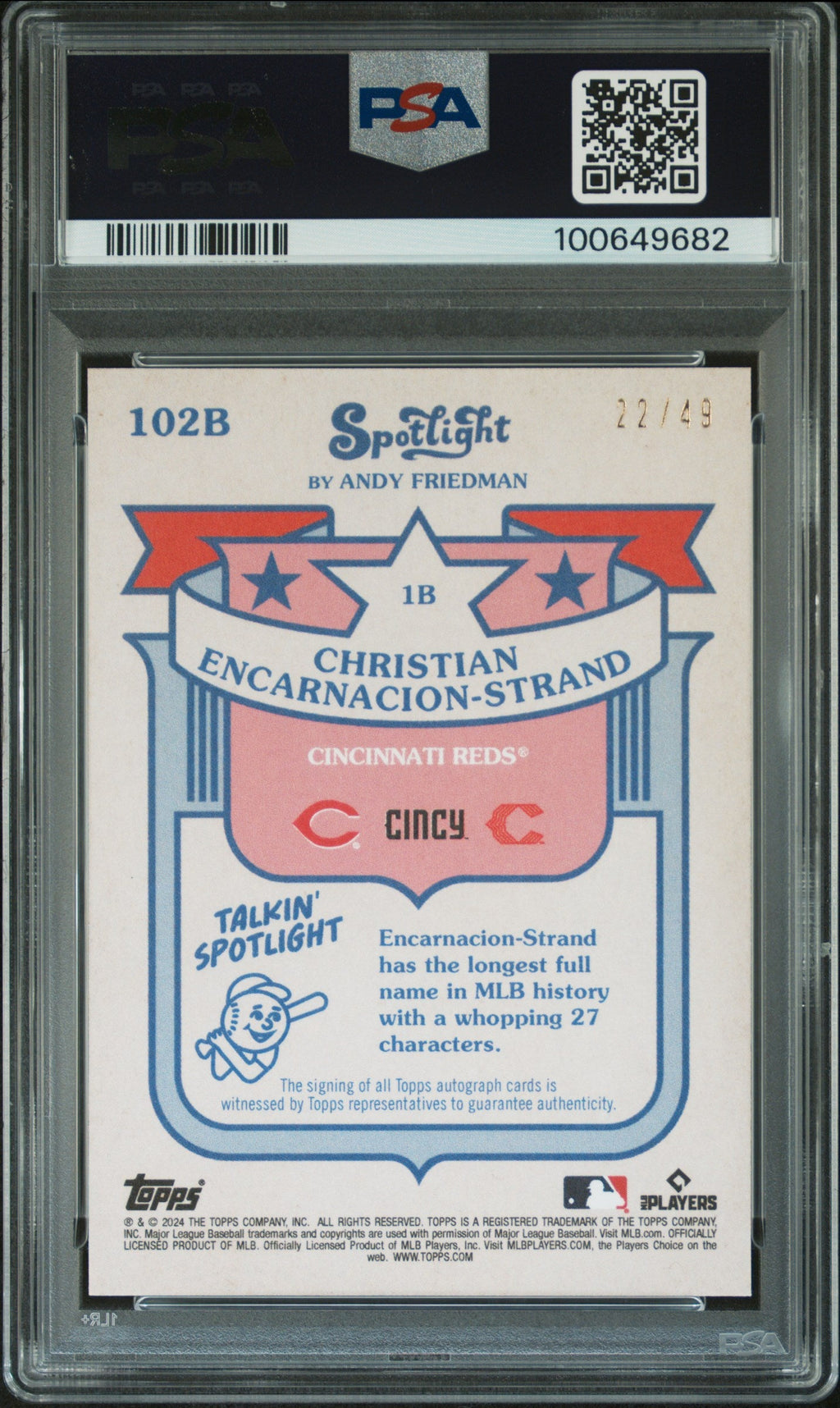 You are purchasing a 2024 Topps Spotlight Autographs Christian Encarnacion-Strand Grayscale Filter #102B PSA 9. You will receive the exact item in the photographs. Thank you for looking. Listed With Mascot.