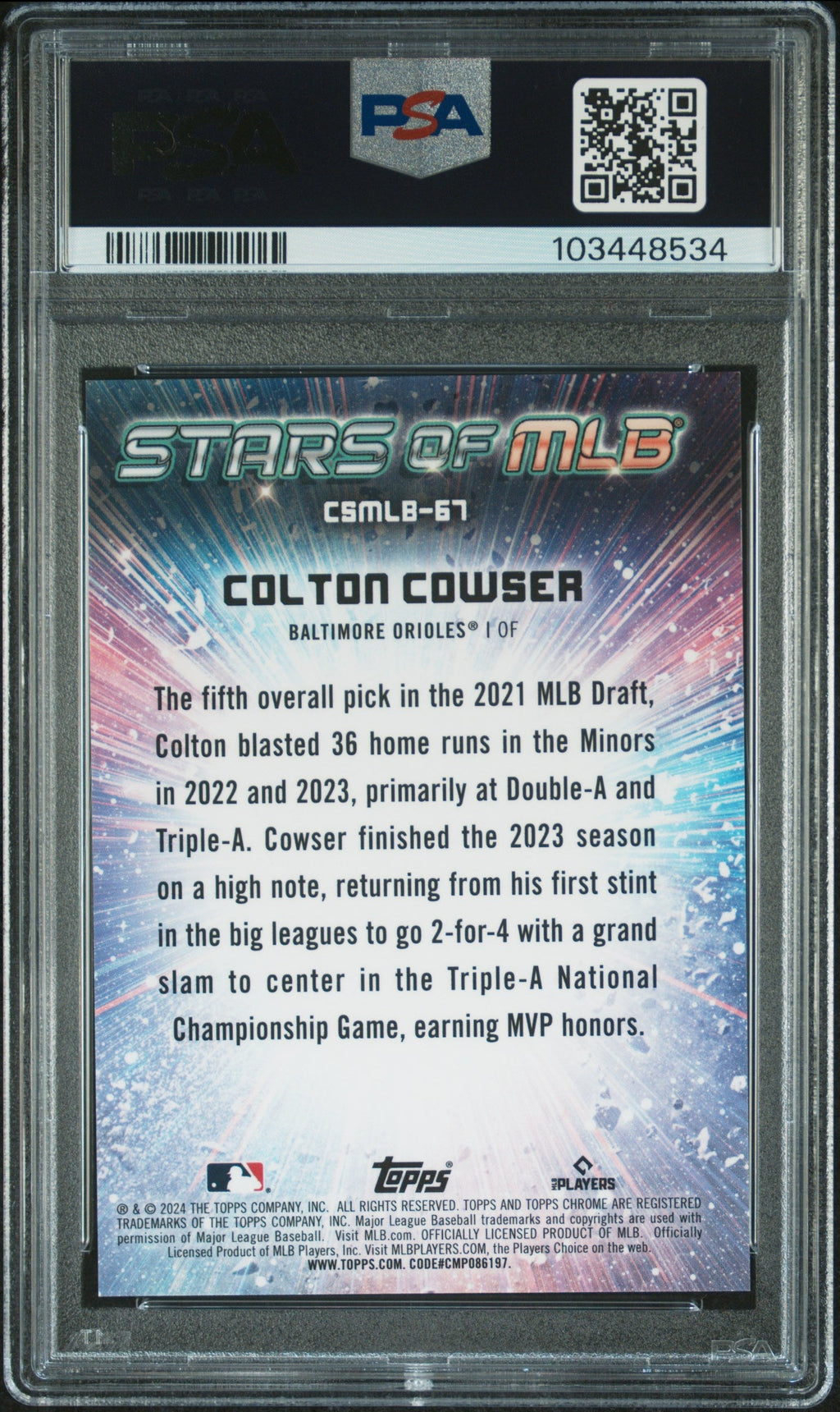 You are purchasing the following: 2024 Topps Stars Of MLB Chrome Colton Cowser Red Ref #CSMLB67 PSA 10 . You will receive the exact item in the photographs. Note: Please do not connact us and asking the following: 1. What is the lowest you would take? Just make an offer. If the offer is automatically declined, you have your answer. 2. What the best you can do? See above. Not repling to an email is a reply. 3. Any room on this? See above. Not repling to an offer is a reply. 4. We ONLY do one counter offer, so please make your best offer the first time! Note: If the price off, in your option, please send your resaoning and an offer. We will review it. Note: We manage nearly 10 millon cards regularly and will adjust prices as errors are noticed or pointed out! Listed With Mascot.