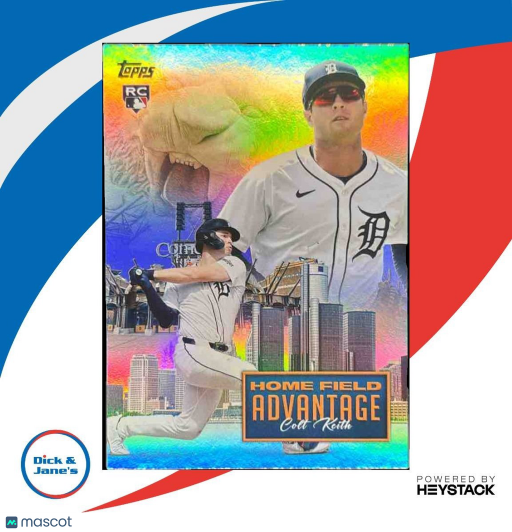 Collect this rare 2024 Topps Update Colt Keith Homefield Advantage #HFA-37 trading card featuring the Detroit Tigers player. Limited edition and highly sought after, this MLB card boasts exclusive Homefield Advantage design. Add it to your collection today! Listed With Mascot.
