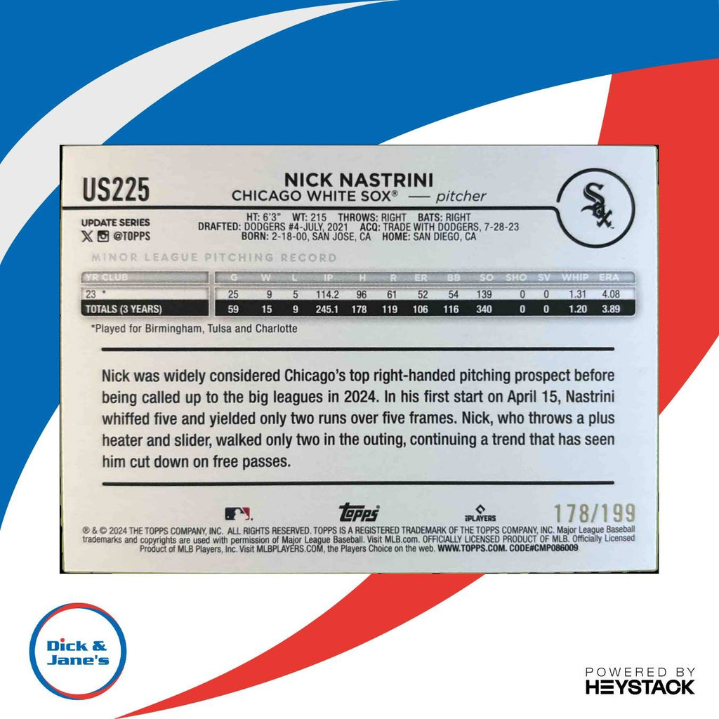 2024 Topps Update Nick Nastrini Red Crackle Foilboard /199 #US225 RC White Sox Listed With Mascot.