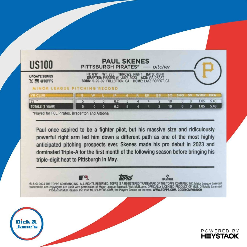 This limited edition 2024 Topps Update Paul Skenes Rainbow Foil #US100 RC trading card is a must-have for any Pittsburgh Pirates or MLB fan! Featuring a stunning rainbow foil design, this rookie card is a rare find that captures the excitement of Skenes' debut season. Don't miss your chance to own a piece of baseball history! Listed With Mascot.