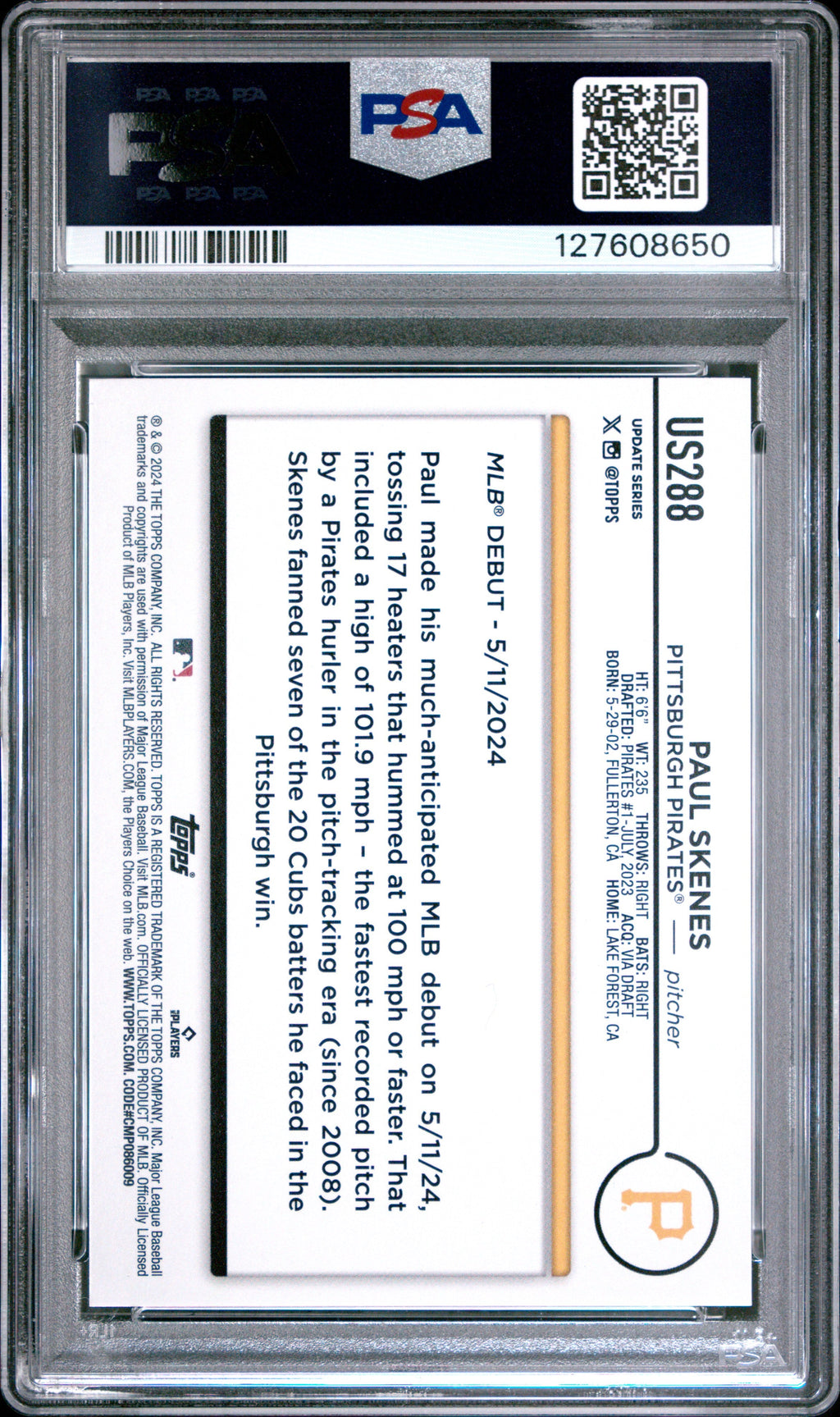 2024 Topps Update Paul Skenes Rookie #US288 PSA 9 MINT Pittsburgh Pirates Don’t miss your chance to own this highly sought-after 2024 Topps Update Paul Skenes Rookie card, graded PSA 9 MINT! This standout collectible celebrates one of baseball’s hottest rookies, showcasing Skenes in his Pittsburgh Pirates uniform and featuring the official rookie designation. Professionally authenticated by PSA with certification number 127608650, this card is a must-have for collectors and Pirates fans looking to invest in the future of the sport. With only 1,057 cards graded at this level and 1,272 graded higher, this card offers both rarity and exceptional condition. Whether you’re adding to your personal collection or searching for the perfect gift for a baseball enthusiast, this PSA 9 rookie is a fantastic addition. Secure it today and celebrate Paul Skenes’ promising career! Set: 2024 Topps Update Certification Number: 127608650 Grader: Professional Sports Authenticator (PSA) Player/Athlete: Paul Skenes Year Manufactured: 2024 Grade: 9 Graded: Yes Sport: Baseball Population Higher: 1272 Manufacturer: Topps Population: 1057 Team: Pittsburgh Pirates Features: Rookie Card Number: US288 Listed With Mascot.
