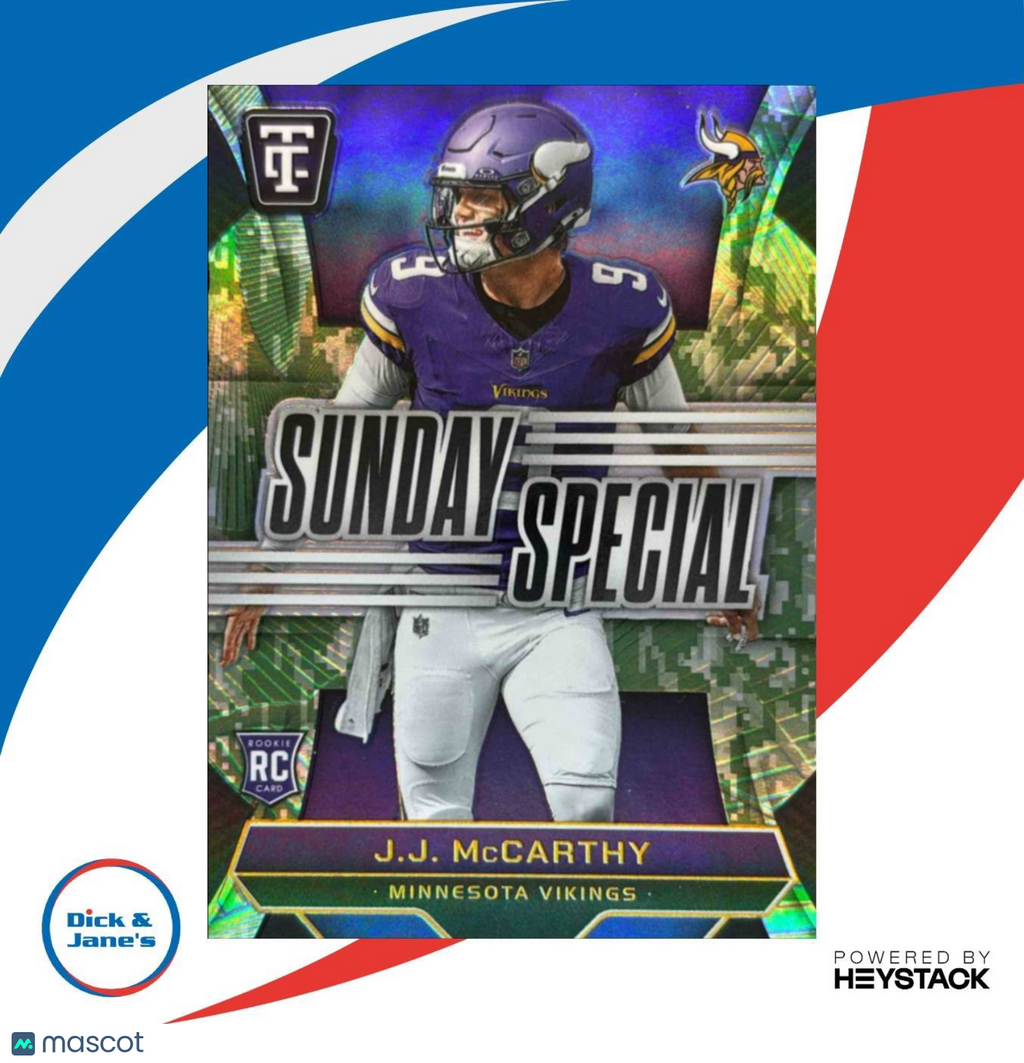 Capture the excitement of J.J. McCarthy's rookie year with this rare 2024 Totally Certified Mirror Platinum Camo trading card. Limited to only 35 copies, this NFL card features a stunning design and is a must-have for any Vikings fan or card collector. Don't miss your chance to own a piece of football history with this rookie card. Listed With Mascot.