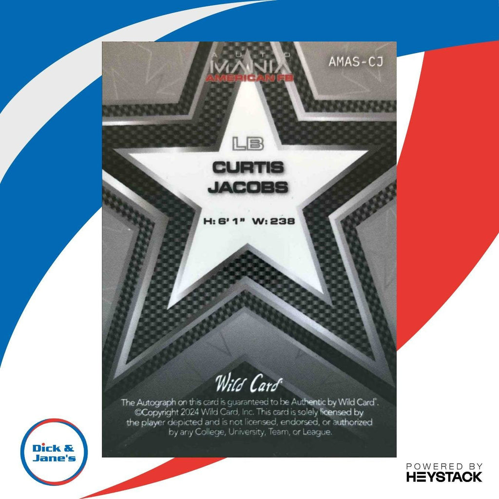 This exclusive 2024 Wild Card Automania Curtis Jacobs trading card features an authentic autograph from the American football star himself. Limited to only 25 copies, this NCAAF collectible showcases Jacobs in action, making it a must-have for any Lions fan or sports card collector. Listed With Mascot.