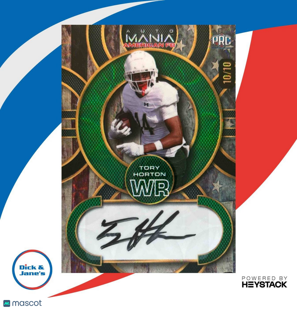 Own a piece of history with this limited edition 2024 Wild Card Automania American Tory Horton trading card. Featuring an authentic autograph and a stunning green design, this card is a must-have for NCAAF fans and collectors. Don't miss your chance to own this rare piece, only 10 available! Listed With Mascot.