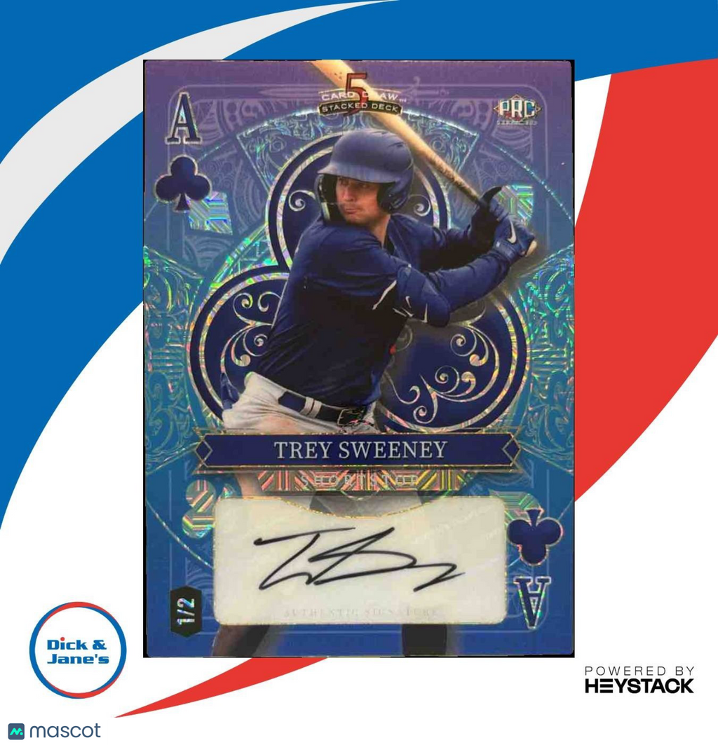 : This rare 2024 Wild Card Five Draw Trey Sweeney Auto Ace of Clubs /2 sports trading card features an authentic autograph from the player himself. Limited edition with only 2 in existence, making it a prized possession for any collector. Don't miss out on adding this unique piece to your collection! Listed With Mascot.