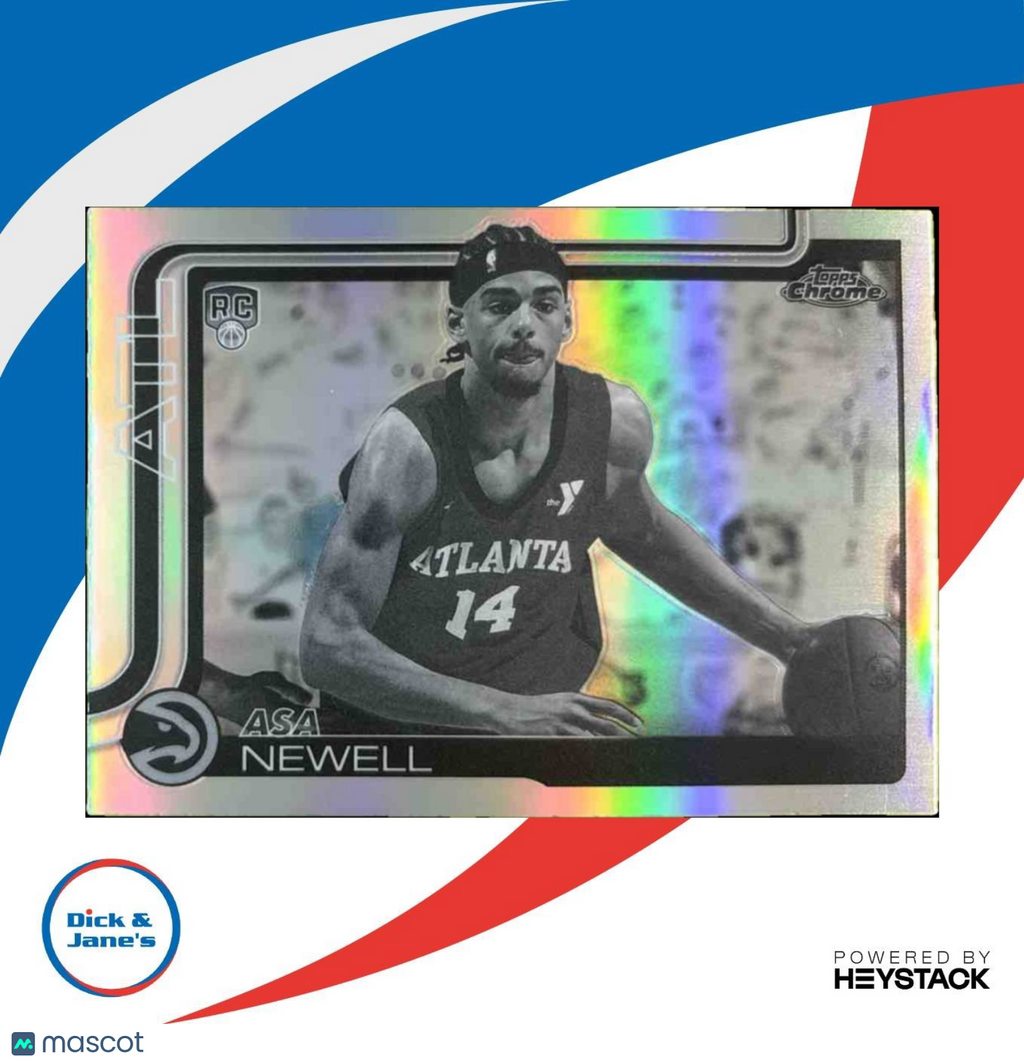 The 2025-26 Topps Chrome Asa Newell Negative Refractor #273 RC Atlanta Hawks trading card is a must-have for any NBA card collector. Featuring a rookie card of Asa Newell with a unique negative refractor design, this limited edition card is a rare find that showcases Newell's talent and potential in the league. Don't miss out on adding this unique and eye-catching card to your collection today! Listed With Mascot.