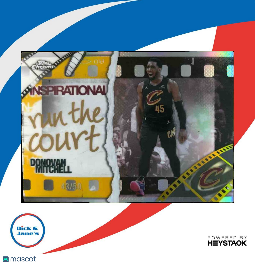 For sale: Rare 2025-26 Topps Chrome basketball trading card featuring Donovan Mitchell in a Cleveland Cavaliers jersey. This Inspirational Gold card is limited to only 50 copies worldwide. A must-have for any basketball card collector or Donovan Mitchell fan. Don't miss out on this unique and valuable piece of sports memorabilia! Listed With Mascot.
