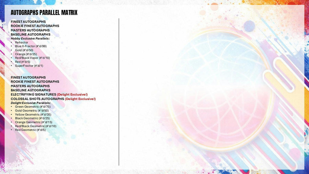 Autographs remain a cornerstone of Finest, highlighted by Finest Autographs, Masters Autographs, Colossal Shots Autographs, and Electrifying Signatures, with the addition of the new Baseline Autographs, bringing a clean, artistic take to on-card ink. Look for Lebron James, Wemby, Cooper Flagg, Kon Kneuppel and legends like Dwyane Wade and Kareem Abdul-Jabbar.