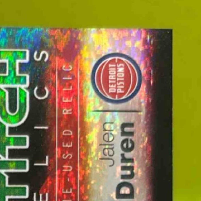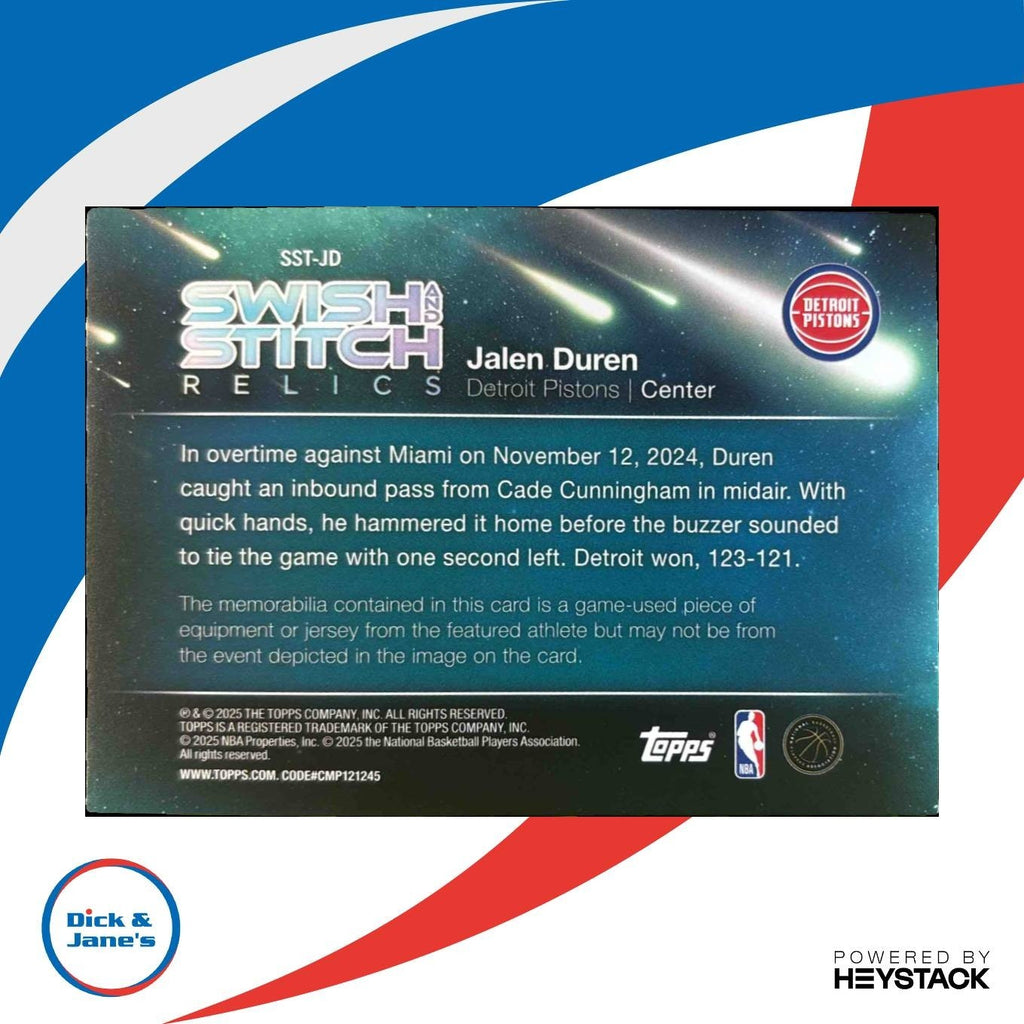 Own a piece of NBA history with the 2025-26 Topps Jalen Duren Swish and Stitch Relic Green Holo card! This exclusive card features a game-worn jersey patch from Duren himself, limited to only 99 copies in existence. Don't miss out on this rare collectible item showcasing the rising star of the Memphis Pistons. Listed With Mascot.