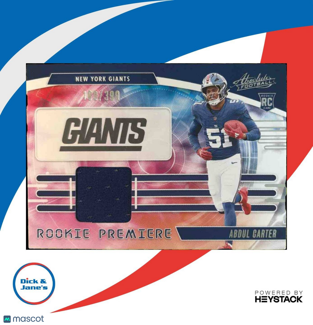 The 2025 Absolute Abdul Carter Rookie Premiere Materials card features an exclusive piece of game-worn jersey from the New York Giants' rising star. Limited to only 399 copies, this NFL trading card is a must-have for collectors and fans alike. Don't miss out on owning a piece of football history! Listed With Mascot.