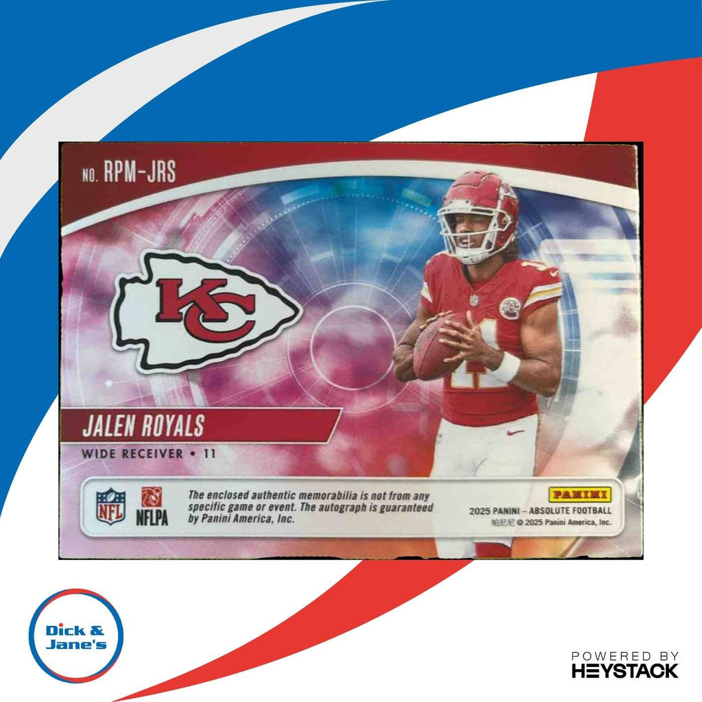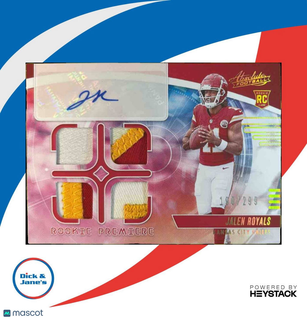 Own a piece of NFL history with this 2025 Absolute Jalen Royals Rookie Premiere Quad Patch Auto trading card. Limited edition numbered out of 299, featuring a rare autograph and quad patch design. Perfect for Kansas City Chiefs fans and collectors looking to add to their memorabilia collection. Get yours now! Listed With Mascot.
