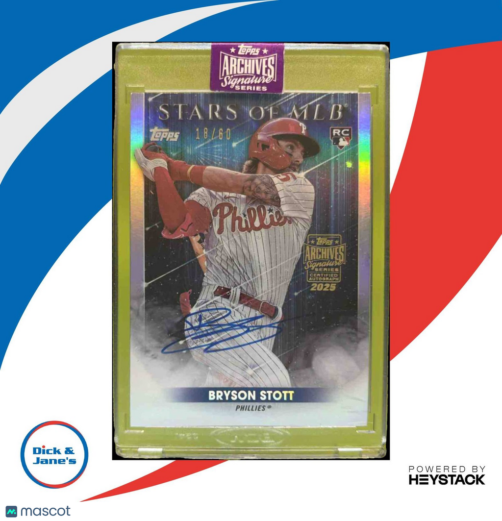 elegance, autographed by MLB star Bryson Stott of the Phillies. Limited to only 60 cards, this 2025 Archives Signatures Series is a must-have for any baseball card collector. Featuring Stott's rookie card, this rare find is a valuable addition to any sports memorabilia collection. Listed With Mascot.
