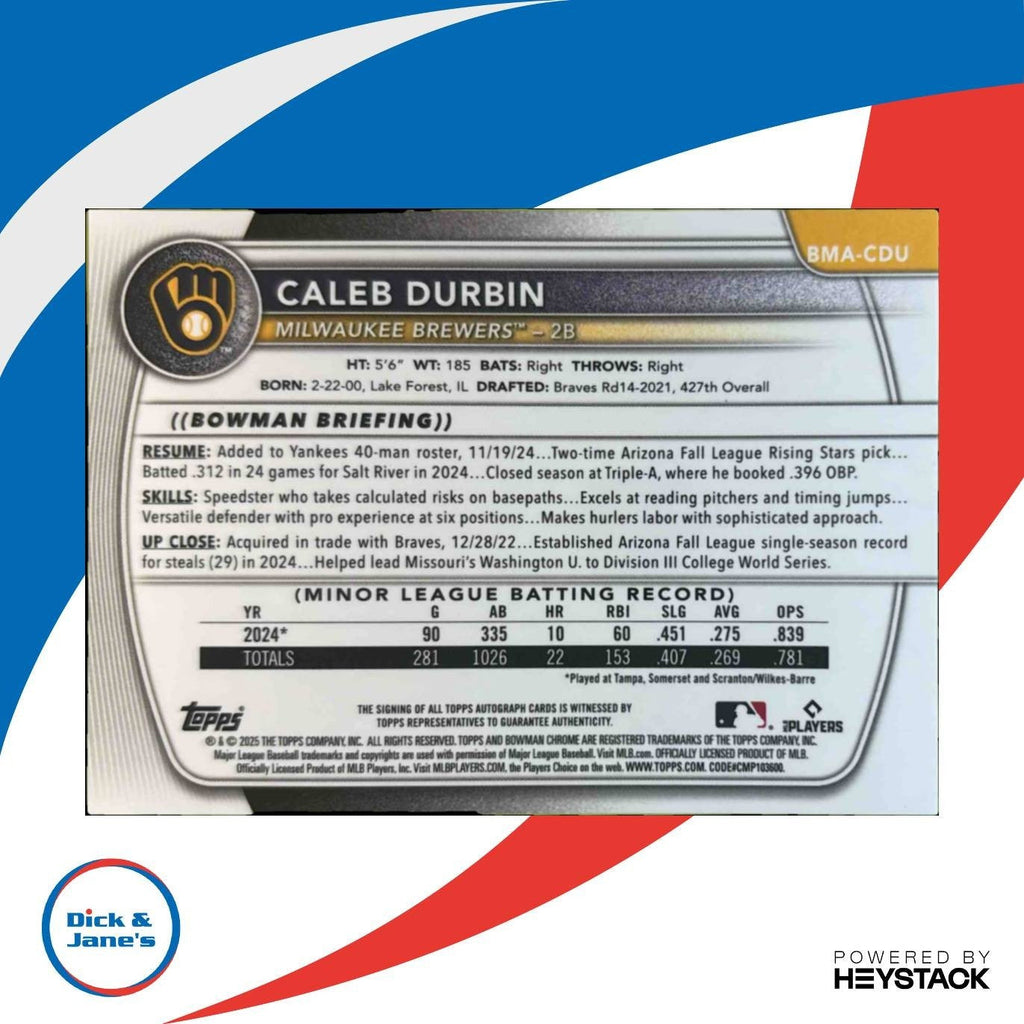 The 2025 Bowman Caleb Durbin Chrome Prospect Auto Mega Box Refractor card features an autographed chrome prospect card of Brewers player, Caleb Durbin. A must-have for any MLB collector, this card is a rare find and a valuable addition to any trading card collection. Get yours today! Listed With Mascot.