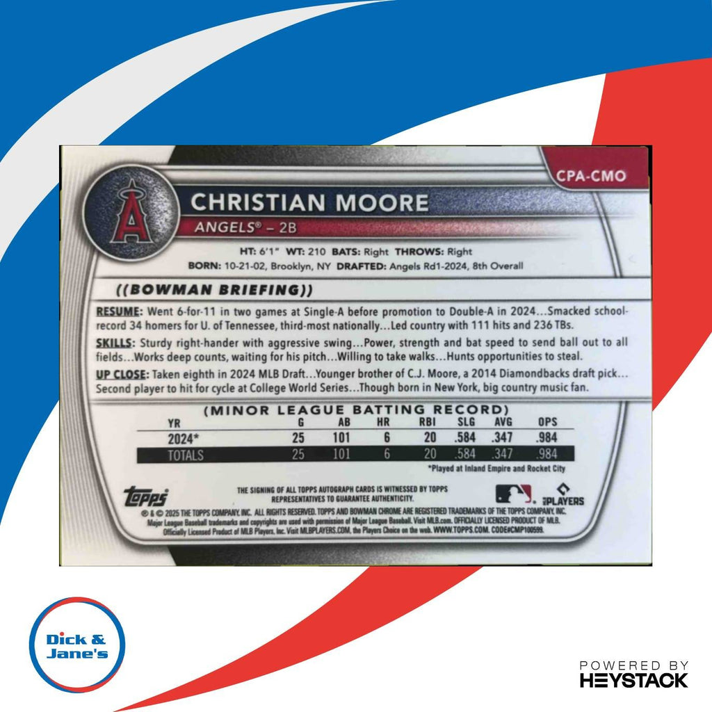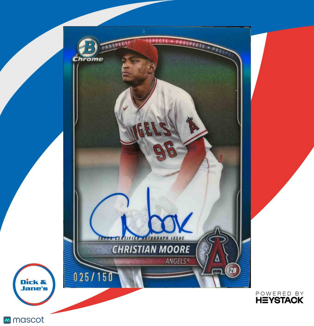 Exciting addition to your MLB card collection! This 2025 Bowman Christian Moore Chrome Prospect Auto True Blue Refractor 25/150 card features a rare autograph, limited edition numbering, and high-quality chrome design. Don't miss out on owning this valuable piece of sports memorabilia! Listed With Mascot.