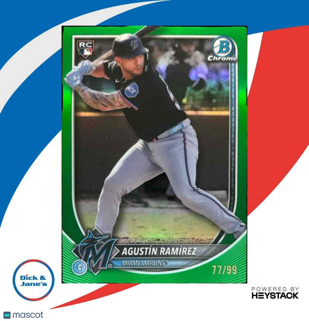 Own a piece of baseball history with the 2025 Bowman Chrome Agustin Ramirez Green Refractor trading card. This RC card features the up-and-coming player from the Miami Marlins and is numbered 77/99. Don't miss your chance to add this rare and collectible card to your collection! Listed With Mascot.