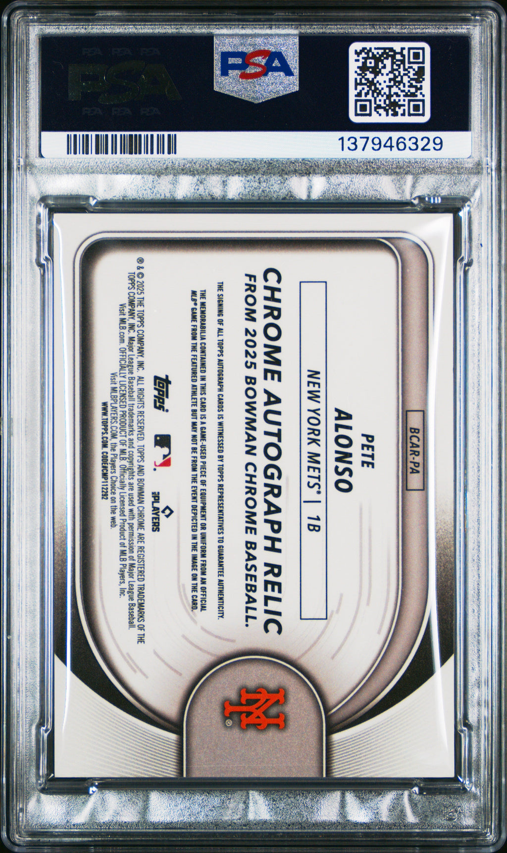 2025 Bowman Chrome Chrome Autograph Relics Pete Alonso BLK Ref 05/10 PSA 9 MINT Don’t miss your chance to own this rare 2025 Bowman Chrome Chrome Autograph Relics Pete Alonso BLK Ref card, serial numbered 05/10 and professionally graded PSA 9! This stunning card features an on-card autograph from New York Mets star Pete Alonso and is one of only two PSA-graded examples in existence, with none graded higher—making it a true gem for serious collectors and Mets fans alike. Certified authentic with PSA certification number 137946329, this limited-edition card is part of the highly sought-after BLK Ref parallel and showcases Alonso’s signature in bold. Secure this investment-grade collectible today and elevate your collection with a card that stands out for its rarity, eye appeal, and impeccable condition! Autographed: Yes Set: 2025 Bowman Chrome Chrome Autograph Relics Signed By: Pete Alonso Certification Number: 137946329 Grader: Professional Sports Authenticator (PSA) Grade: 9 Player/Athlete: Pete Alonso Year Manufactured: 2025 Serial Number: 05/10 Graded: Yes Sport: Baseball Population Higher: 0 Parallel/Variety: BLK Ref Manufacturer: Bowman Population: 2 Team: New York Mets Card Number: BCAR-PA Listed With Mascot.