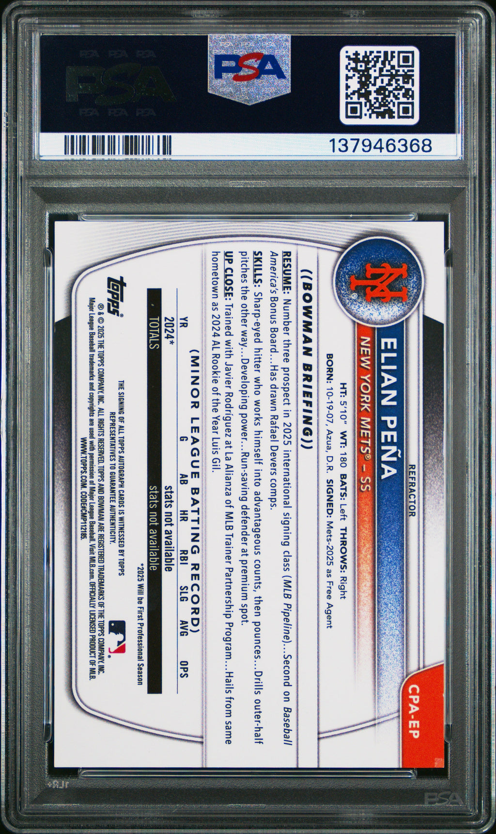2025 Bowman Chrome Prospect Autographs Elian Pena Refractor Rookie 58/499 #CPAEP PSA 9 New York Mets Don’t miss your chance to own this highly sought-after 2025 Bowman Chrome Prospect Autographs Elian Pena Refractor rookie card, serial numbered 58/499 and professionally graded PSA 9! This card features an on-card autograph from Elian Pena of the New York Mets, making it a must-have for serious collectors and Mets fans alike. With only 24 in the population and just 8 graded higher, this rare parallel is a standout addition to any high-end baseball card collection. Certified by PSA with authentication number 137946368, this card is part of the popular Bowman Chrome set and boasts the coveted rookie card designation. Secure this limited edition Refractor before it’s gone—perfect for investment or display! Autographed: Yes Set: 2025 Bowman Chrome Prospect Autographs Signed By: Elian Pena Certification Number: 137946368 Grader: Professional Sports Authenticator (PSA) Grade: 9 Year Manufactured: 2025 Player/Athlete: Elian Pena Serial Number: 58/499 Graded: Yes Sport: Baseball Population Higher: 8 Parallel/Variety: Refractor Manufacturer: Bowman Population: 24 Team: New York Mets Features: Rookie Card Number: CPAEP Listed With Mascot.