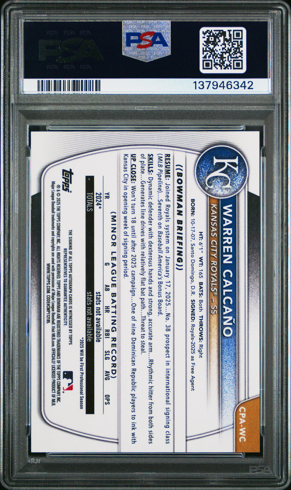2025 Bowman Chrome Autographs Warren Calcano Blue Reptilian /150 PSA 9 MINT Don’t miss your chance to own this stunning 2025 Bowman Chrome Prospect Autographs Blue Reptilian parallel, featuring rookie sensation Warren Calcano of the Kansas City Royals! This limited edition card is serial numbered 083/150, autographed by Calcano, and professionally graded PSA 9 MINT—making it a must-have for serious collectors and baseball fans alike. With only 2 cards graded at this level and just 1 graded higher, this rare gem stands out in any collection. Backed by PSA certification and boasting rookie status, this card is a fantastic investment and centerpiece for any Bowman or Royals collection. Secure this exclusive collectible today before it’s gone! Autographed: Yes Set: 2025 Bowman Chrome Prospect Autographs Signed By: Warren Calcano Certification Number: 137946342 Grader: Professional Sports Authenticator (PSA) Grade: 9 Player/Athlete: Warren Calcano Year Manufactured: 2025 Serial Number: 083/150 Graded: Yes Sport: Baseball Population Higher: 1 Parallel/Variety: Blue Reptilian Manufacturer: Bowman Population: 2 Team: Kansas City Royals Features: Rookie Card Number: CPAWC Listed With Mascot.