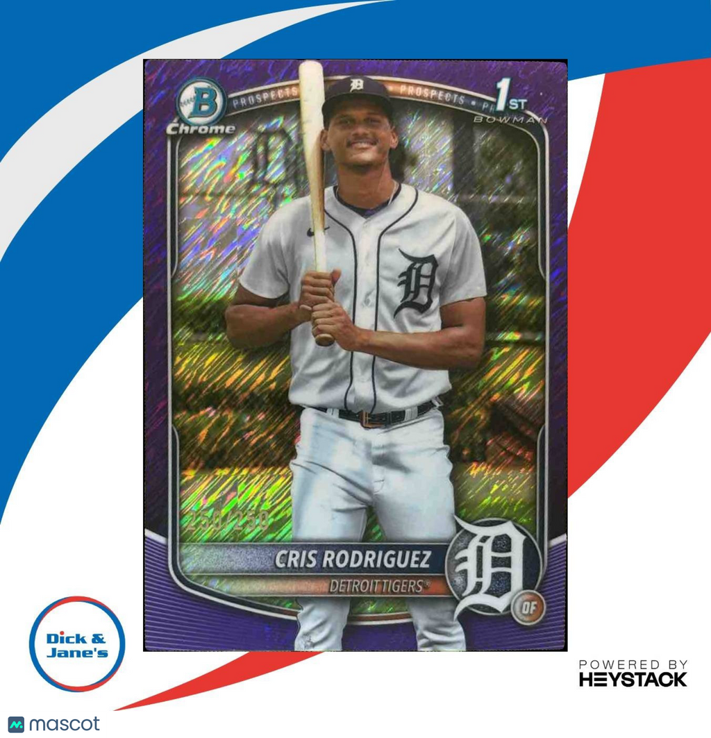 Own a piece of baseball history with the 2025 Bowman Chrome Cris Rodriguez Purple Shimmer /250 1st Prospect Tigers trading card. This MLB card features a highly sought-after rookie prospect from the Detroit Tigers. Limited to only 250 copies, this card is a must-have for any serious collector. Add it to your collection today! Listed With Mascot.