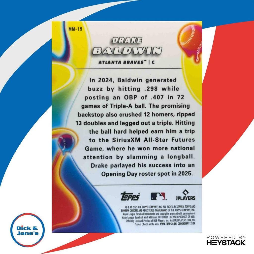 The 2025 Bowman Chrome Drake Baldwin Melt Mashers #MM-19 RC Atlanta Braves trading card is a must-have for any MLB collector. Featuring the rookie card of the talented Drake Baldwin, this card showcases his skills as a member of the Atlanta Braves. Don't miss out on adding this rare and valuable card to your collection! Listed With Mascot.