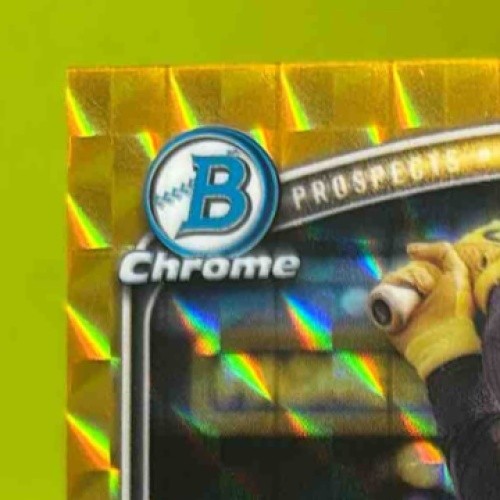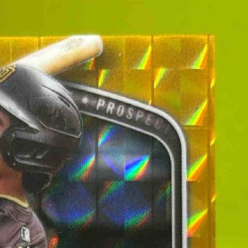 Limited edition Ethan Salas Prospects Gold Geometric trading card from 2025 Bowman Chrome series. Numbered /50, this rare MLB card features the promising Padres player in a stunning gold design. A must-have for any true baseball card collector. Get yours before it's gone! Listed With Mascot.