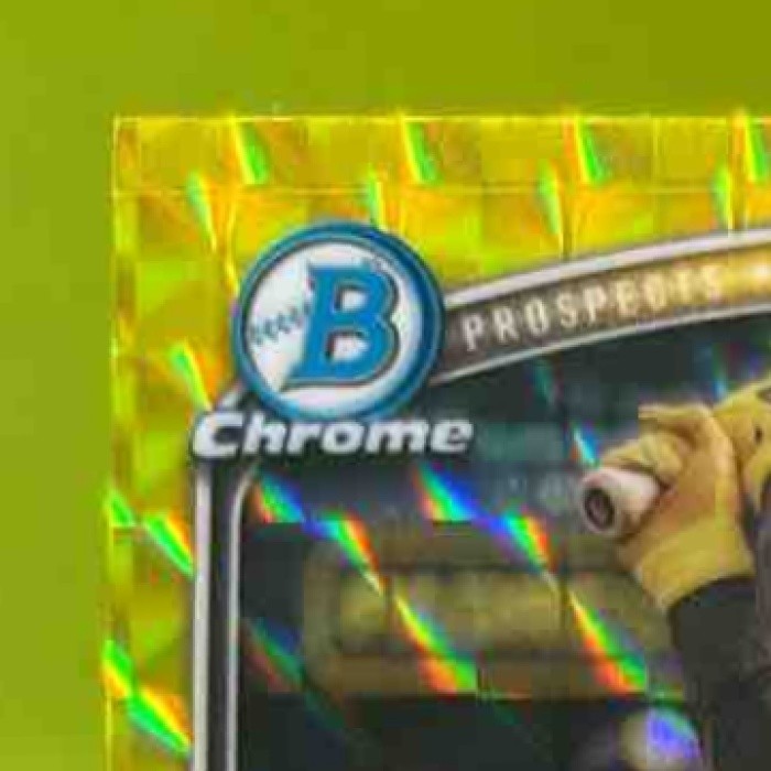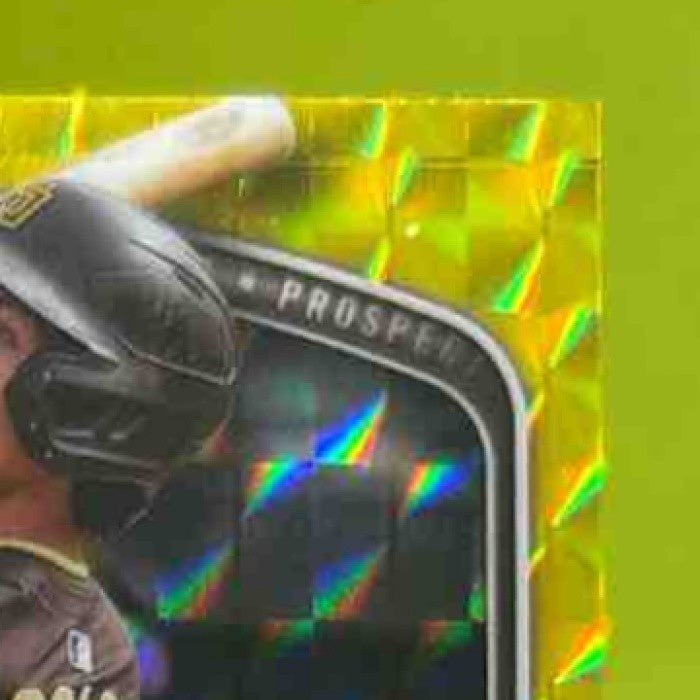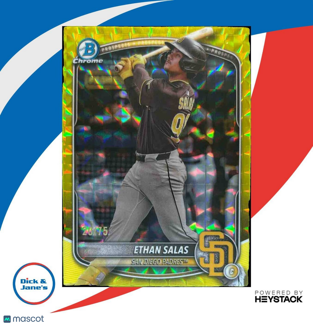 The 2025 Bowman Chrome Ethan Salas Prospects Yellow Geometric card is a rare MLB collectible featuring the Padres player with only 75 in existence. This limited edition card is a must-have for any sports trading card enthusiast looking to add a unique and valuable piece to their collection. Listed With Mascot.