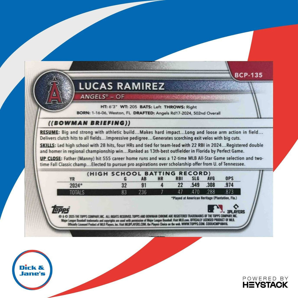 This rare 2025 Bowman Chrome Lucas Ramirez Gold Shimmer card is a must-have for any Angels fan or collector. Limited to just 50 produced, this 1st Prospect card is a standout piece in any collection. Don't miss out on adding this special MLB card to your inventory today! Listed With Mascot.