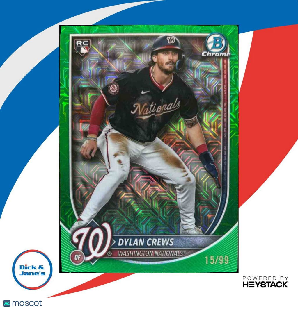 2025 Bowman Chrome Mega Box Dylan Crews Green Mojo /99 #3 RC Nationals - This limited edition MLB trading card features rookie player Dylan Crews in a stunning green mojo design. A must-have for any baseball card collector, with only 99 produced. Get your hands on a piece of history today! Listed With Mascot.
