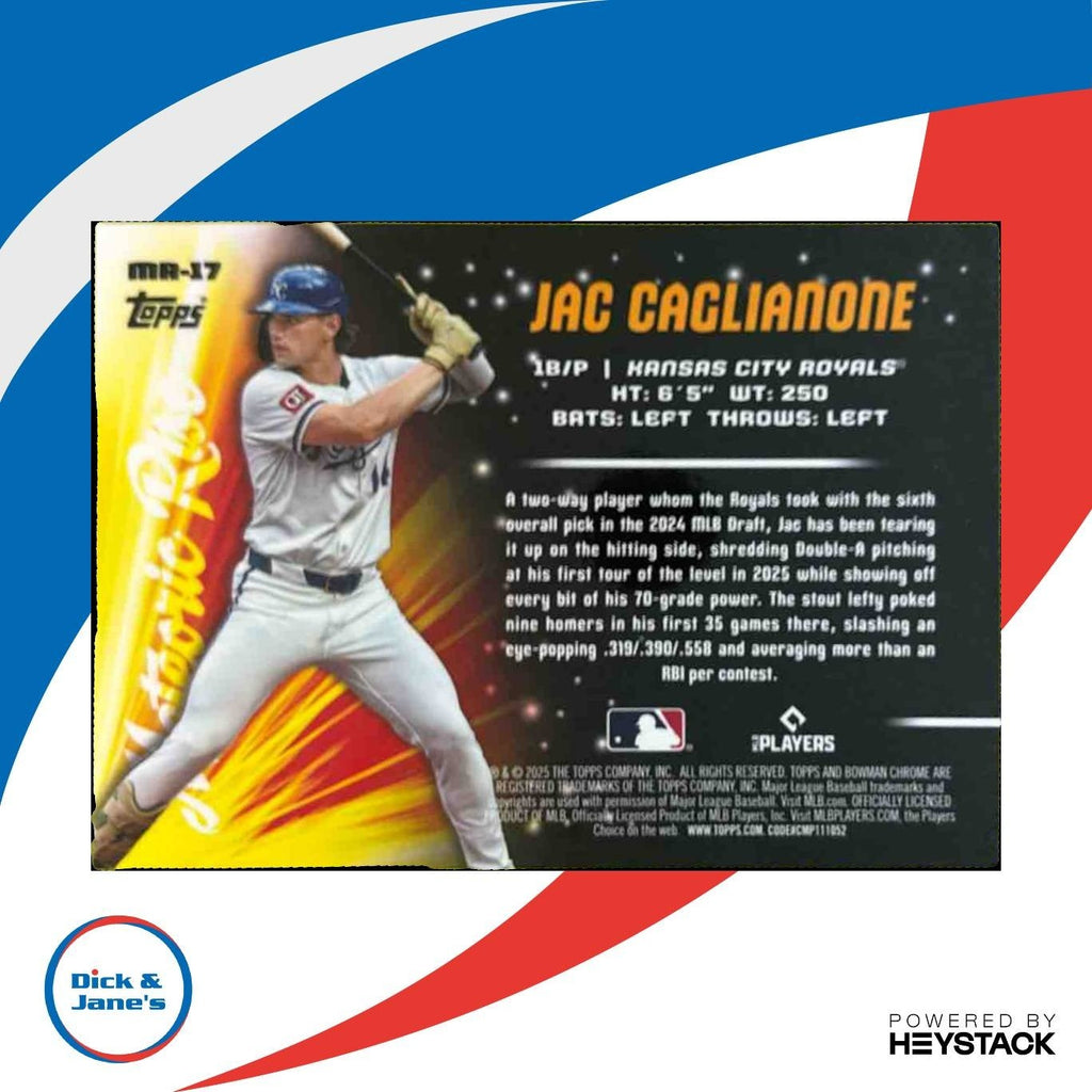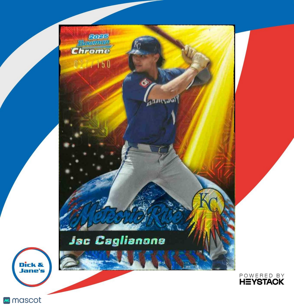 Own a piece of history with this rare 2025 Bowman Chrome Mega Box Jac Caglianone trading card. The stunning blue design highlights his meteoric rise in the MLB, with only 150 produced. Perfect for any Royals fan or collector looking for a standout addition to their collection. Don't miss out on this limited edition card! Listed With Mascot.