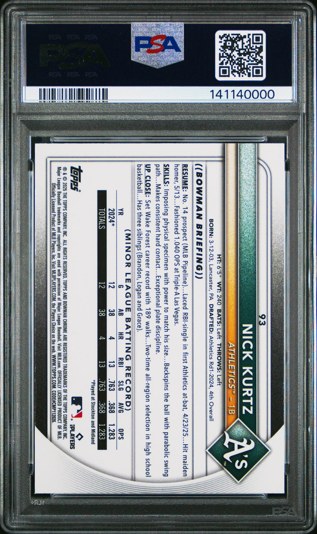 2025 Bowman Chrome Nick Kurtz Fuchsia Refractor Rookie 129/299 #93 PSA 9 MINT Athletics Don’t miss your chance to own this stunning 2025 Bowman Chrome Nick Kurtz Fuchsia Refractor Rookie, serial numbered 129/299 and professionally graded PSA 9 MINT! With only 2 in the population and just 7 graded higher, this rare parallel is a must-have addition for serious collectors and fans of the Athletics’ rising star. The vibrant fuchsia refractor finish and rookie designation make this card a standout investment for your baseball collection. Secure this highly sought-after card today—it’s graded, authenticated, and ready to ship! Whether you’re building your Bowman Chrome rainbow or chasing the hottest rookies of 2025, this Nick Kurtz PSA 9 is a true gem that won’t last long. Act fast and add a piece of future baseball history to your lineup! Set: 2025 Bowman Chrome Certification Number: 141140000 Grader: Professional Sports Authenticator (PSA) Grade: 9 Player/Athlete: Nick Kurtz Year Manufactured: 2025 Serial Number: 129/299 Graded: Yes Sport: Baseball Population Higher: 7 Parallel/Variety: Fuchsia Refractor Manufacturer: Bowman Population: 2 Team: Athletics Features: Rookie Card Number: 93 Listed With Mascot.