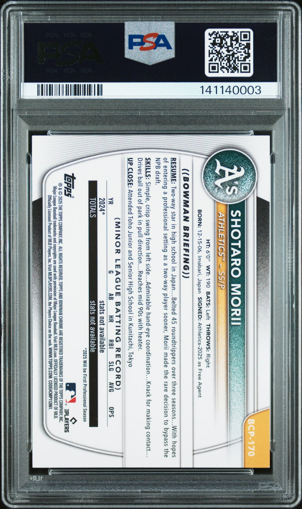 2025 Bowman Chrome Prospects Shotaro Morii Blue Wave Rookie 147/150 #BCP170 PSA 9 MINT Athletics Don’t miss your chance to own this stunning 2025 Bowman Chrome Prospects Shotaro Morii Blue Wave Rookie, serial numbered 147/150 and professionally graded PSA 9 Mint! With only 8 of these cards graded and just 1 graded higher, this rare parallel is a must-have for serious collectors and fans of the rising Athletics star. The Blue Wave finish and rookie status make this card a standout addition to any baseball card collection. Perfect for investment or display, this card comes with PSA certification and features the highly coveted rookie designation. Secure this limited-edition gem before it’s gone—highly sought after and ready to ship to your collection today! Set: 2025 Bowman Chrome Prospects Certification Number: 141140003 Grader: Professional Sports Authenticator (PSA) Grade: 9 Player/Athlete: Shotaro Morii Year Manufactured: 2025 Serial Number: 147/150 Graded: Yes Sport: Baseball Population Higher: 1 Parallel/Variety: Blue Wave Manufacturer: Bowman Population: 8 Team: Athletics Features: Rookie Card Number: BCP170 Listed With Mascot.