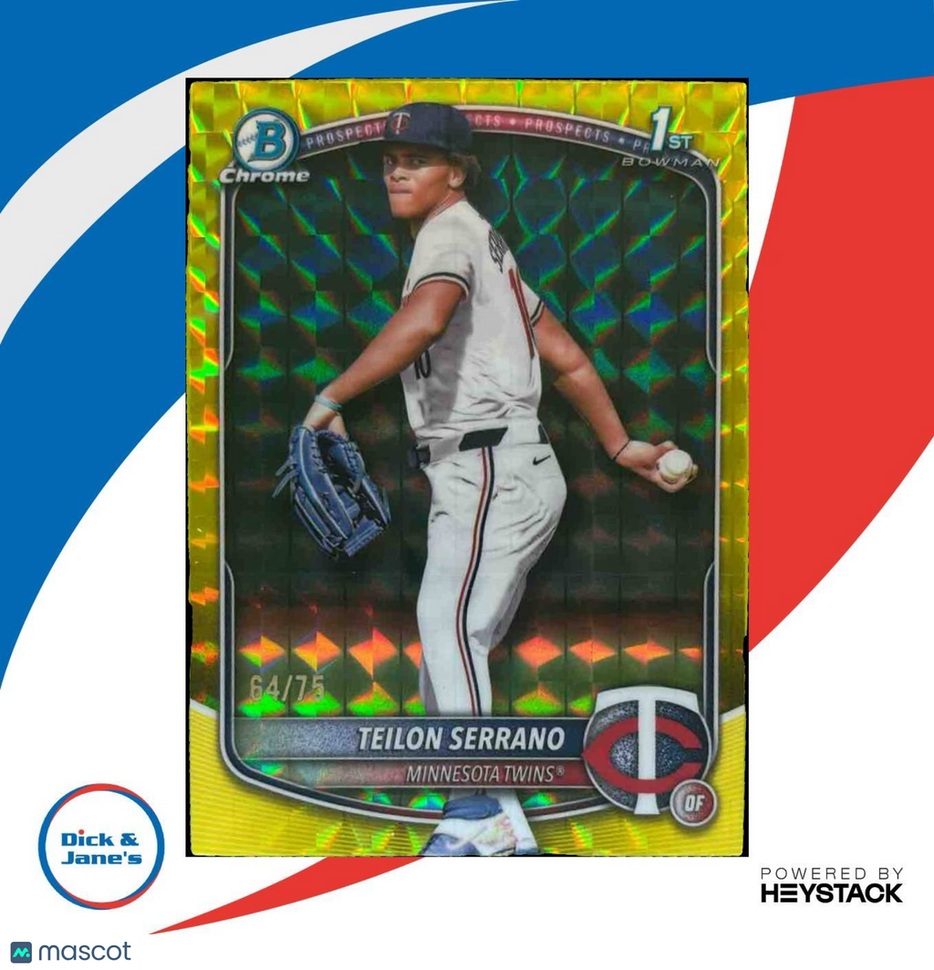 For sale: 2025 Bowman Chrome Teilon Serrano Yellow Geometric /75 #BCP-188 1st Prospect sports trading card. This MLB card features the 1st Prospect in stunning detail with a limited edition run of only 75. Perfect for collectors looking for a rare and valuable addition to their collection. Order now and add this unique card to your portfolio! Listed With Mascot.