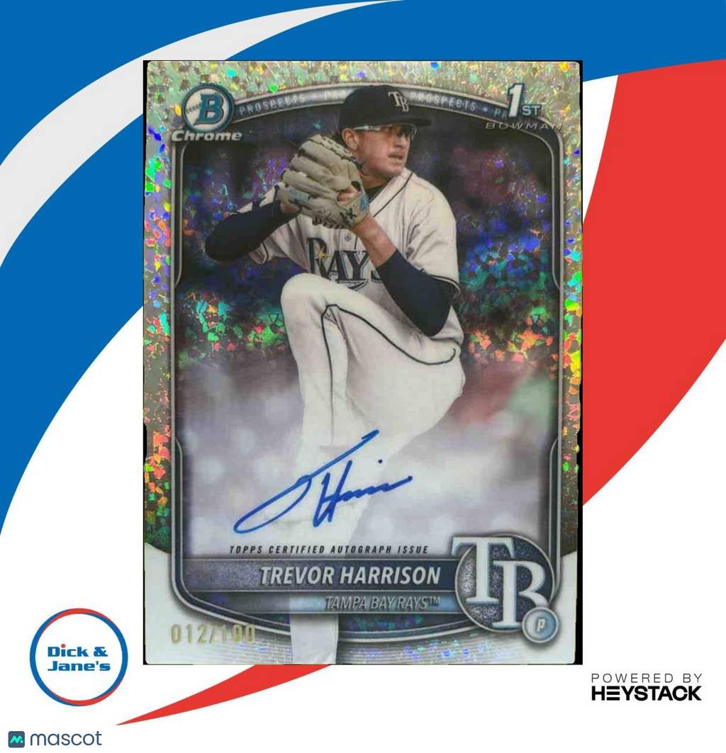 Add this rare and exclusive 2025 Bowman Chrome Trevor Harrison Auto Mini Diamonds trading card to your collection. Limited edition 1st Prospect Rays card with only 100 produced. A must-have for any MLB card enthusiast. Don't miss out on this unique opportunity to own a piece of baseball history. Listed With Mascot.