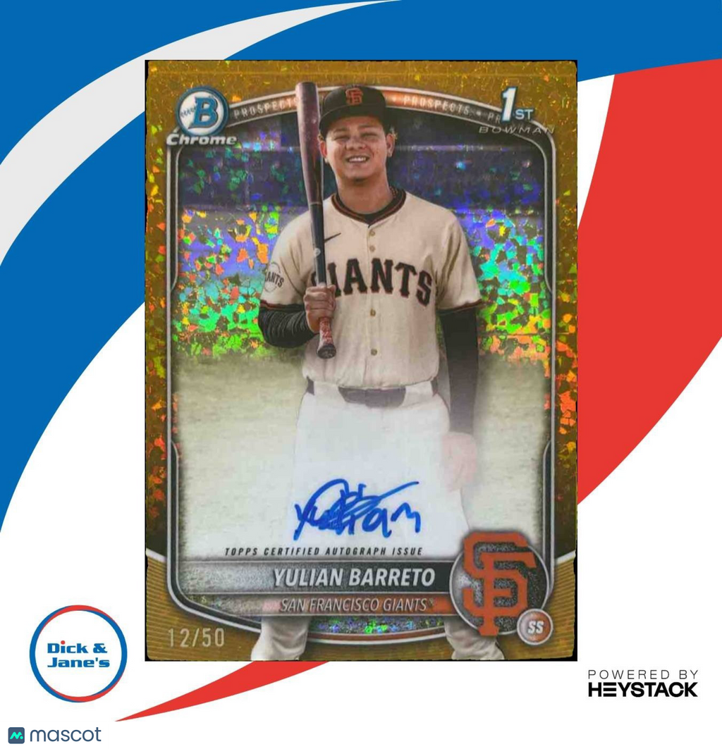 Collectors, don't miss out on the 2025 Bowman Chrome Yulian Barreto Auto Gold Mini Diamonds /50 1st Prospect trading card. This MLB card features a rare 1st Prospect Auto and is a must-have for any serious collector. Limited edition of only 50 cards, don't wait to add this gem to your collection! Listed With Mascot.