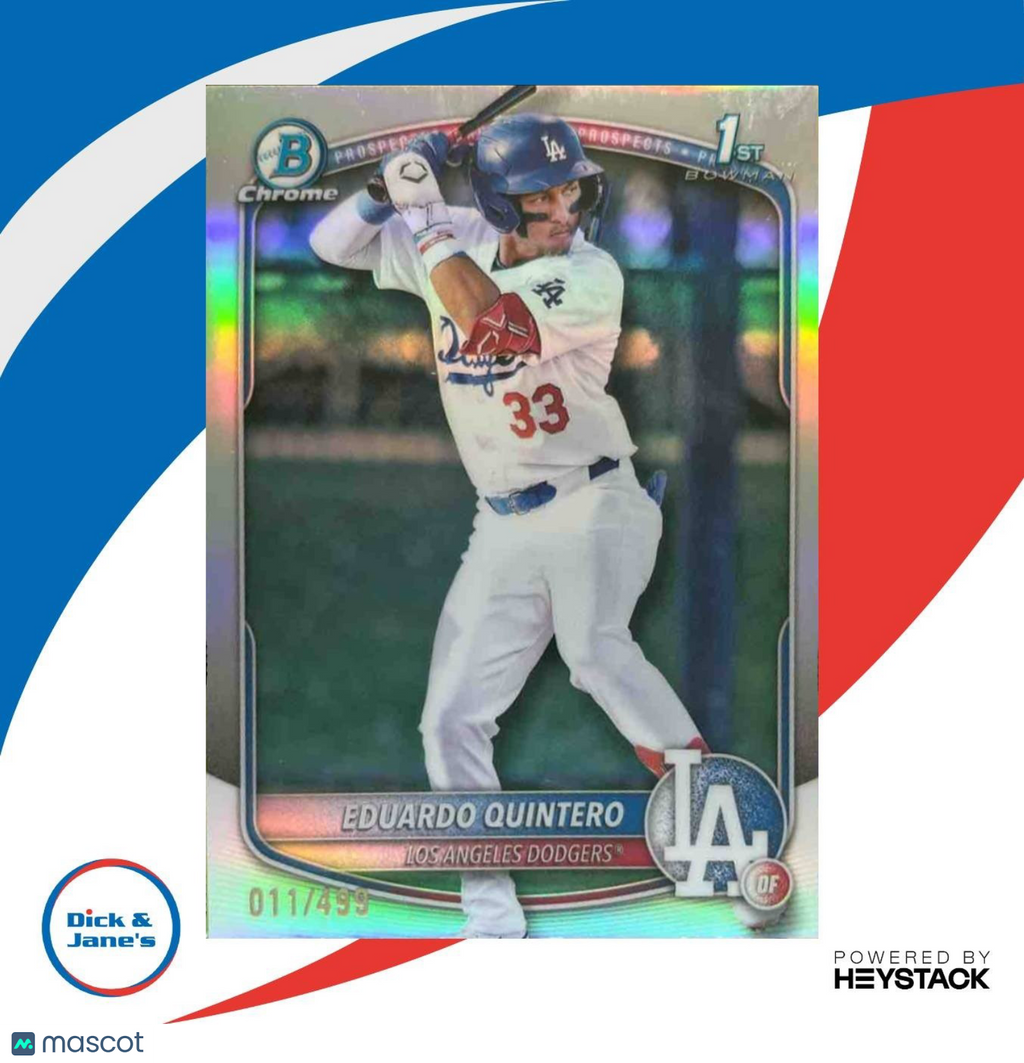 Rare 2025 Bowman Eduardo Quintero Chrome Refractor /499 #BCP-115 1st Prospect Dodgers trading card for sale! Get your hands on this exclusive MLB collectible featuring the promising rookie from the Los Angeles Dodgers. Limited edition, highly sought after. Don't miss out on adding this gem to your collection! Listed With Mascot.