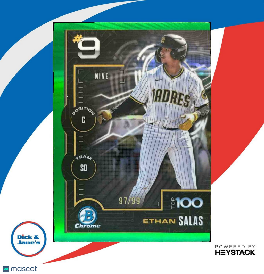 The 2025 Bowman Ethan Salas Scouts' Top 100 Chrome Green /99 #BTP-9 San Diego Padres trading card is a rare find for any collector. With only 99 in existence, this MLB card showcases Salas in his prime and is a must-have for fans and enthusiasts alike. Don't miss out on adding this limited edition card to your collection! Listed With Mascot.