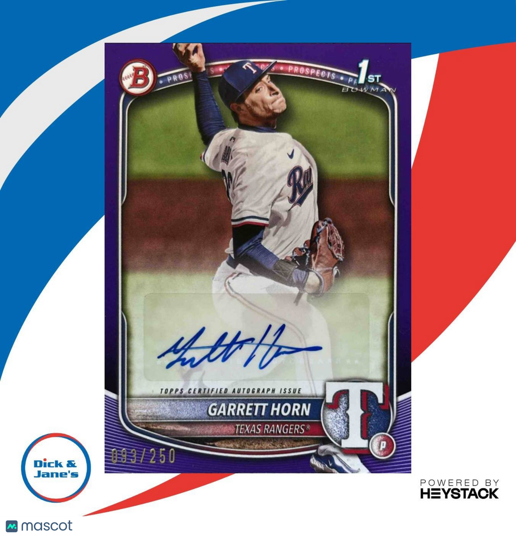 Own a piece of baseball history with this rare 2025 Bowman Garrett Horn trading card. Featuring a unique purple border and an autograph from the first prospect of the Texas Rangers, this limited edition card is a must-have for any collector. Only 250 of these cards were made, making it a valuable addition to any sports memorabilia collection. Listed With Mascot.