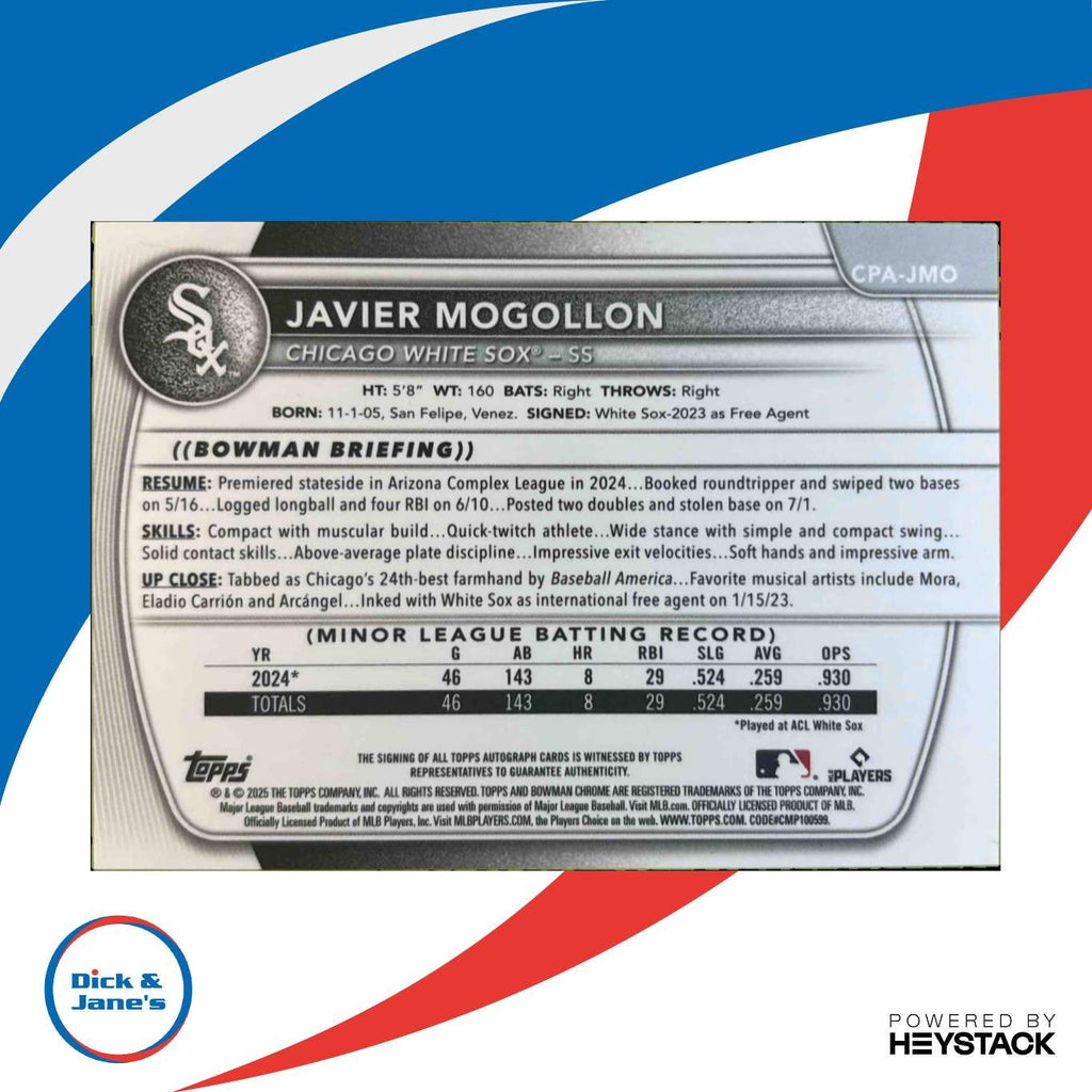 2025 Bowman Javier Mogollon Chrome Auto Reptilian Orange Refractor /25 White Sox Listed With Mascot.