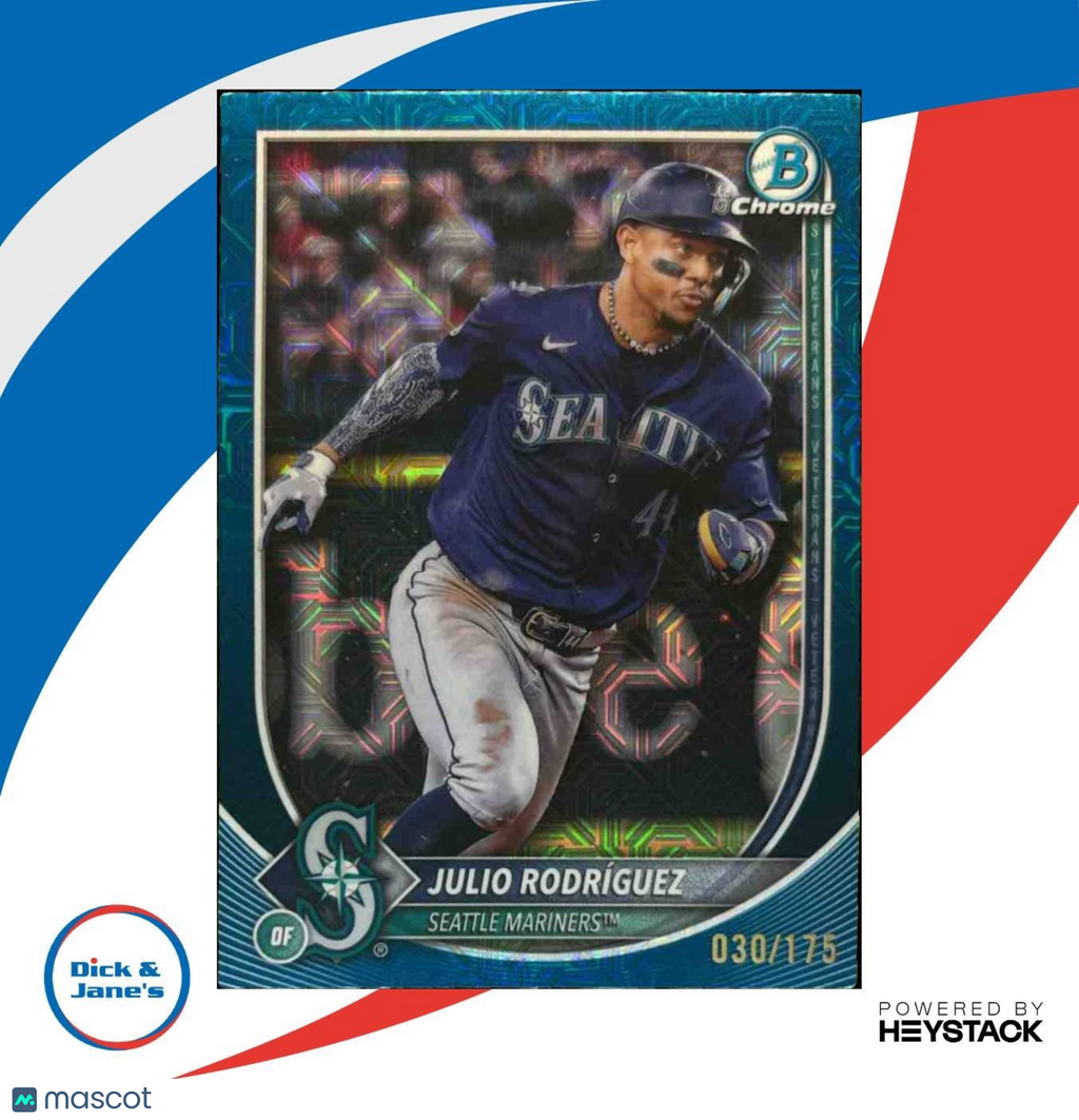 The 2025 Bowman Julio Rodriguez Mega Box Navy Refractor card is a rare find for Seattle Mariners fans. Limited to just 175 copies, this card features a stunning navy refractor design that will make any collector swoon. Don't miss your chance to own a piece of MLB history with this valuable trading card. Listed With Mascot.