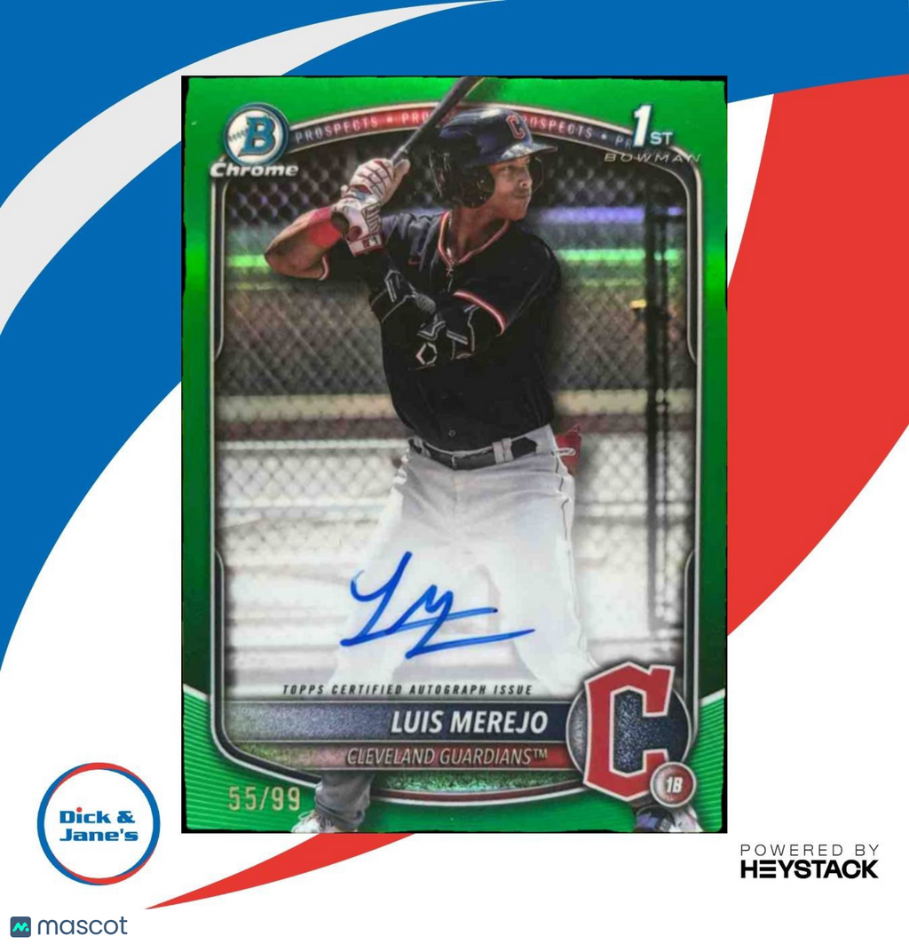 This 2025 Bowman Luis Merejo Chrome Prospect Auto Green Refractor /99 Guardians sports trading card is a must-have for any MLB fan! Featuring a unique green refractor design and autograph from the rising star Luis Merejo, this limited edition card is sure to be a valuable addition to any collection. Don't miss your chance to own a piece of baseball history! Listed With Mascot.