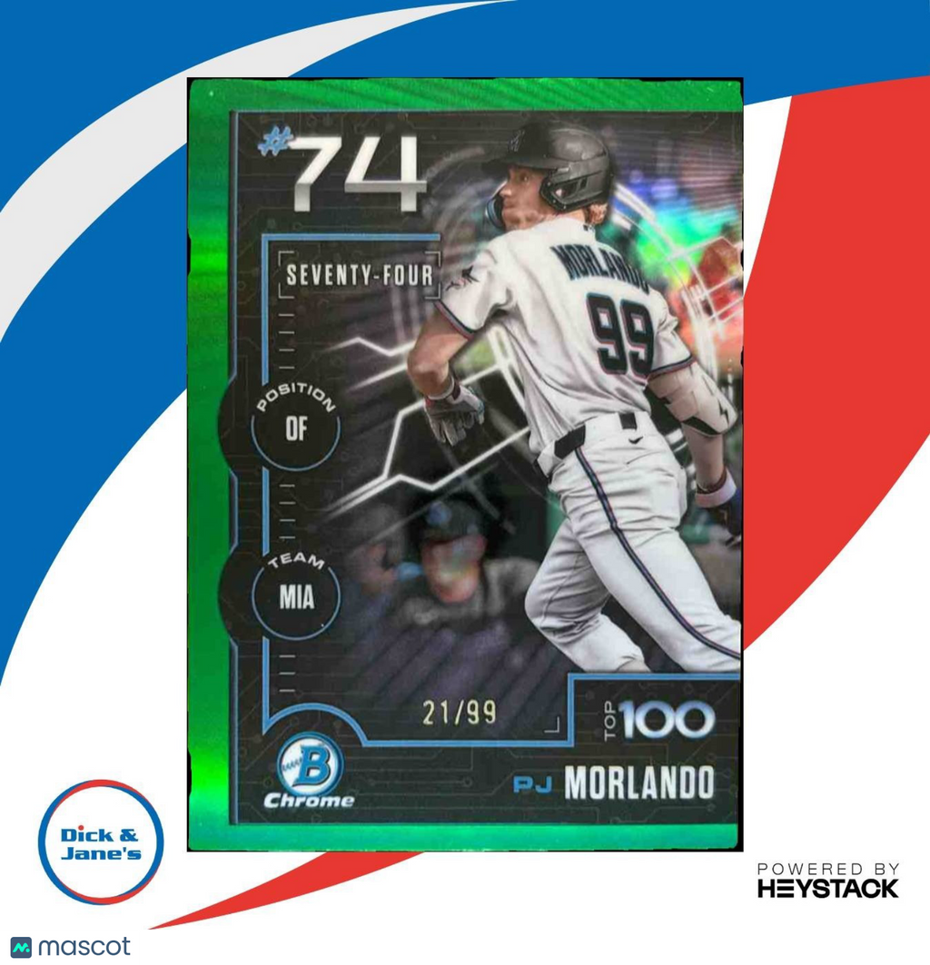 Collectors' dream! Own a piece of history with this rare 2025 Bowman PJ Morlando Scouts' Top 100 Chrome Green /99 #BTP-74 Miami Marlins trading card. Limited edition, numbered to just 99, this MLB card is a must-have for any sports memorabilia enthusiast. Don't miss out on adding this prized possession to your collection today! Listed With Mascot.