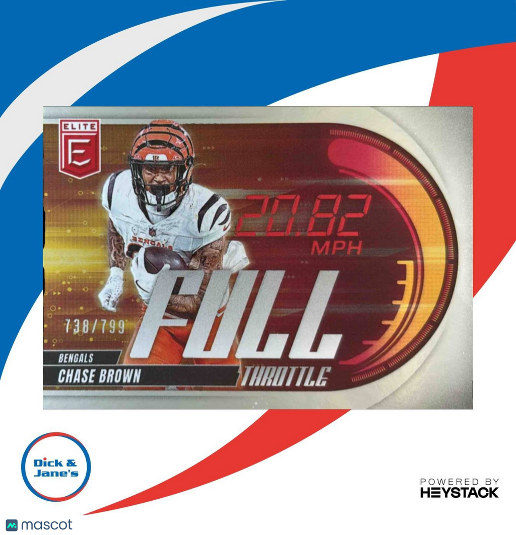 The 2025 Donruss Elite Chase Brown Full Throttle #17 trading card features the dynamic running back from the Cincinnati Bengals. Limited edition card numbered 738/799. A must-have for any NFL collector, showcasing Brown's elite skills on the field. Add this rare gem to your collection today! Listed With Mascot.