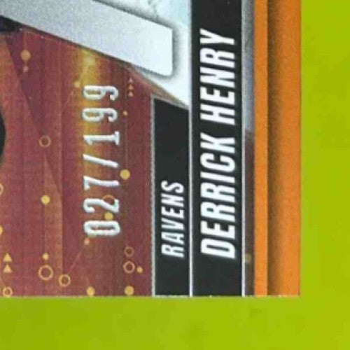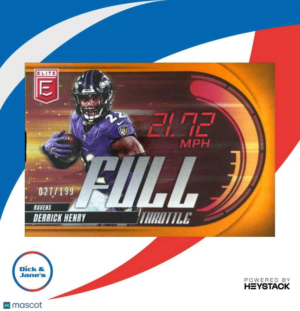 2025 Donruss Elite Derrick Henry Full Throttle Orange 27/199 #8 Baltimore Ravens sports trading card. Limited edition NFL card featuring the elite running back Derrick Henry. Vibrant orange design with only 199 made. A must-have for any avid collector or fan of the Baltimore Ravens. Get your hands on this rare gem before it's gone! Listed With Mascot.